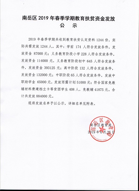 | 南岳区2019年春季贫困幼儿入园补助发放名单 | |||||||||