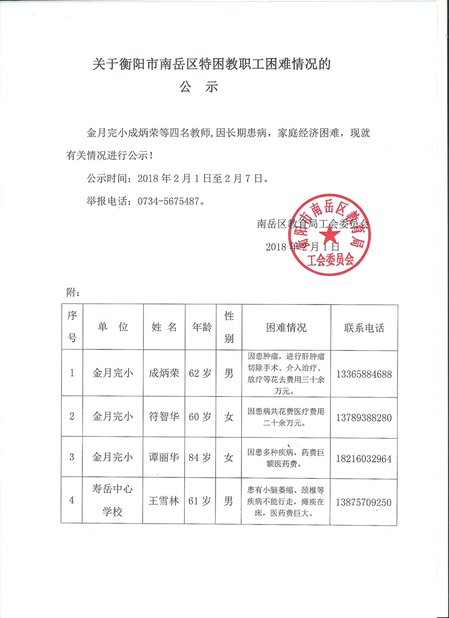 关于衡阳市南岳区特困教职工困难情况的公示