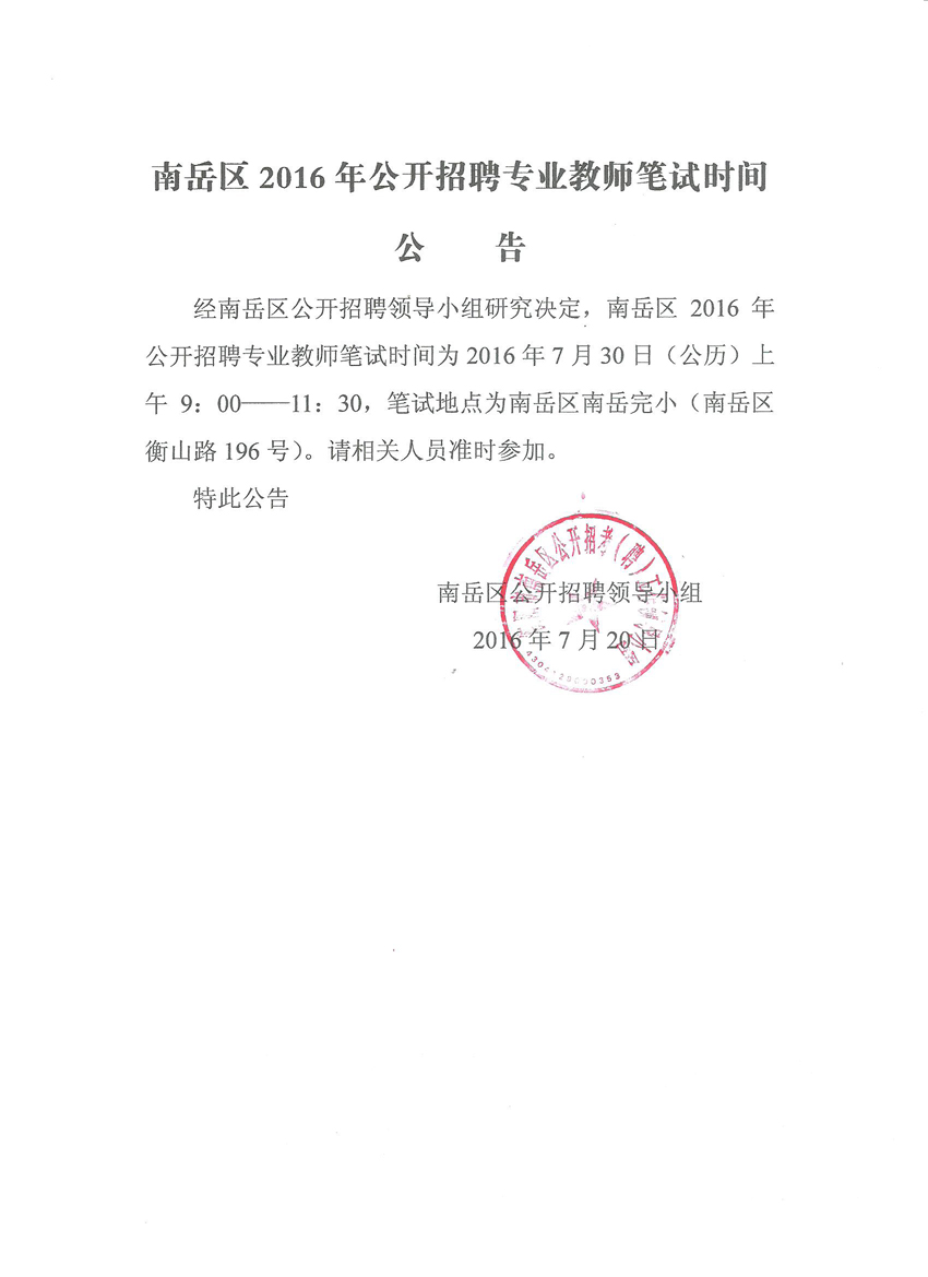 南岳区2016年公开招聘专业教师笔试时间公告