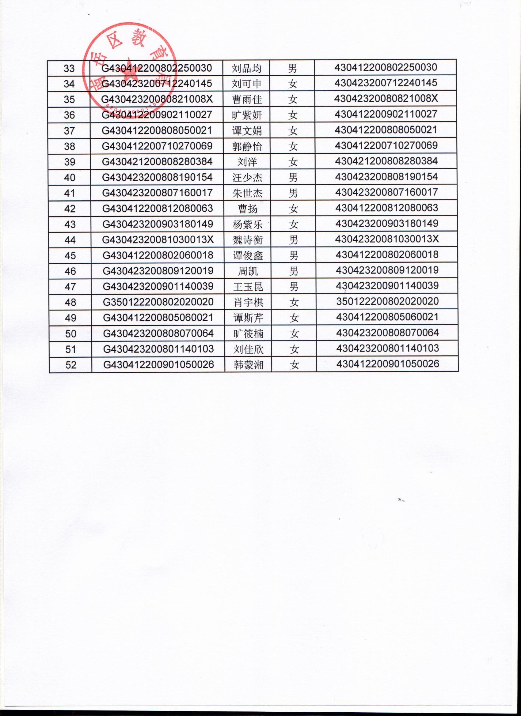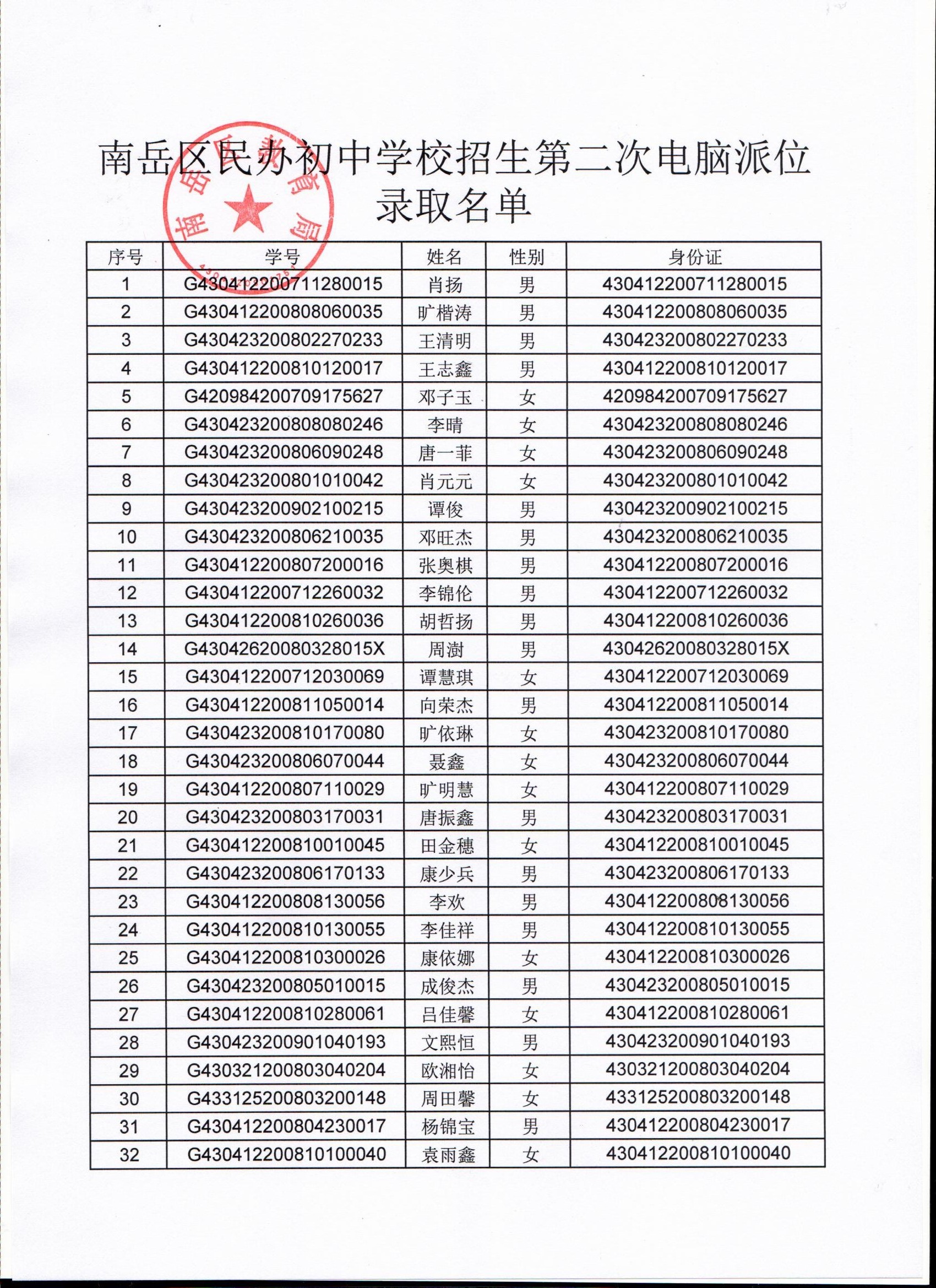 南岳区民办初中学校招生第二次电脑派位录取名单公示