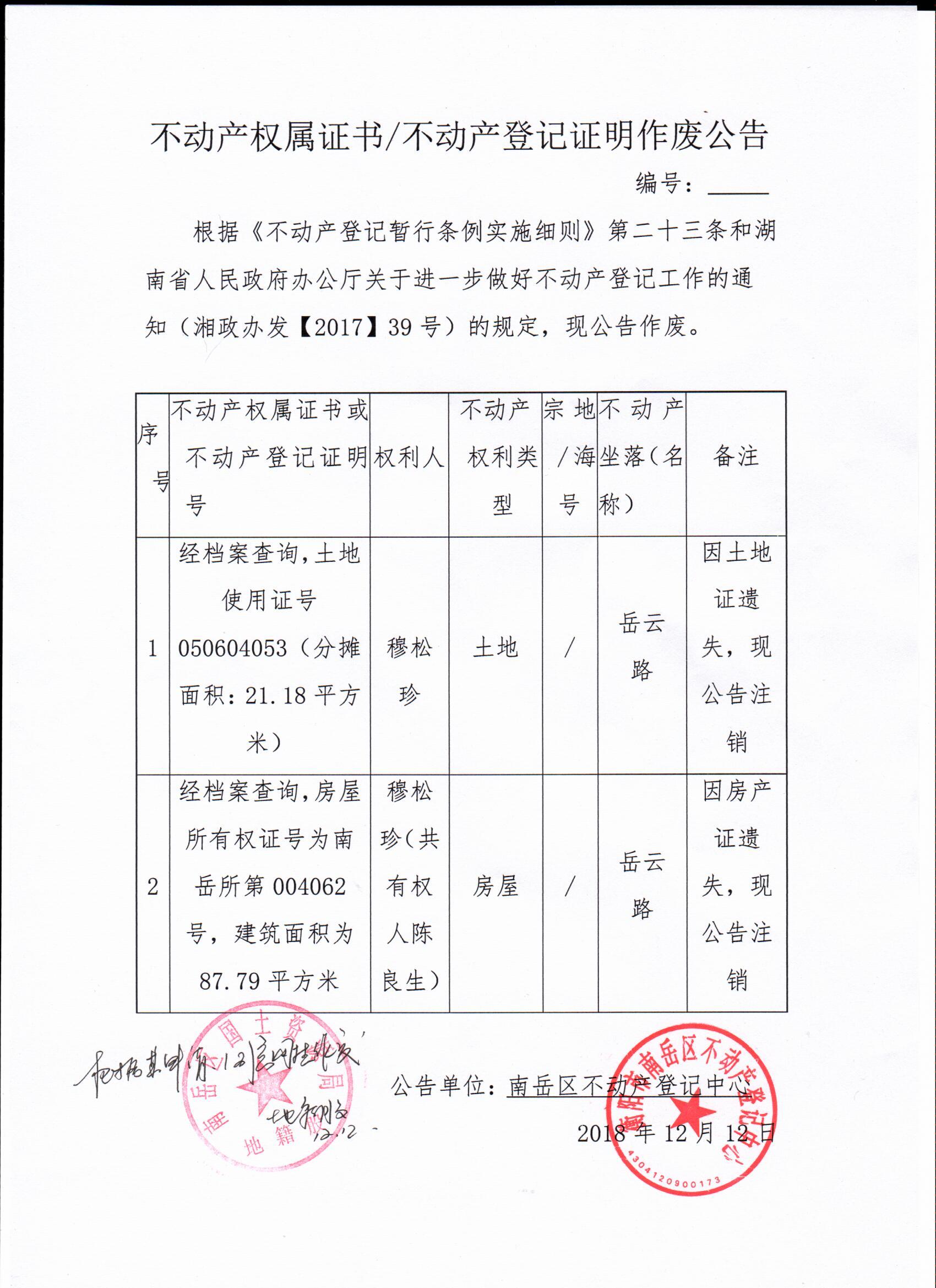 05060453号、南岳所第004062号不动产权属证书/不动产登记证明作废公告