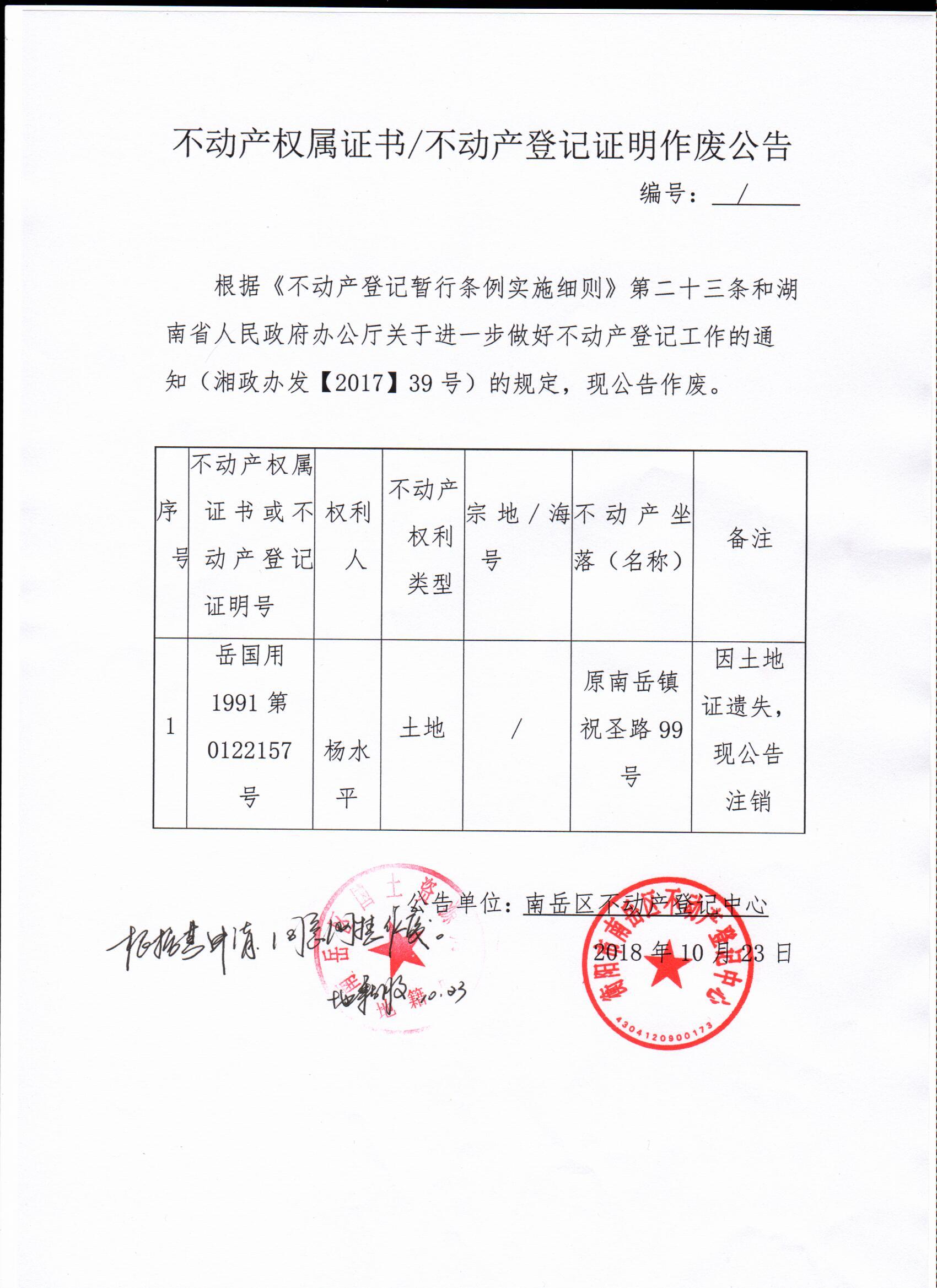 岳国用1991第0122157号不动产权属证书/不动产登记证明作废公告