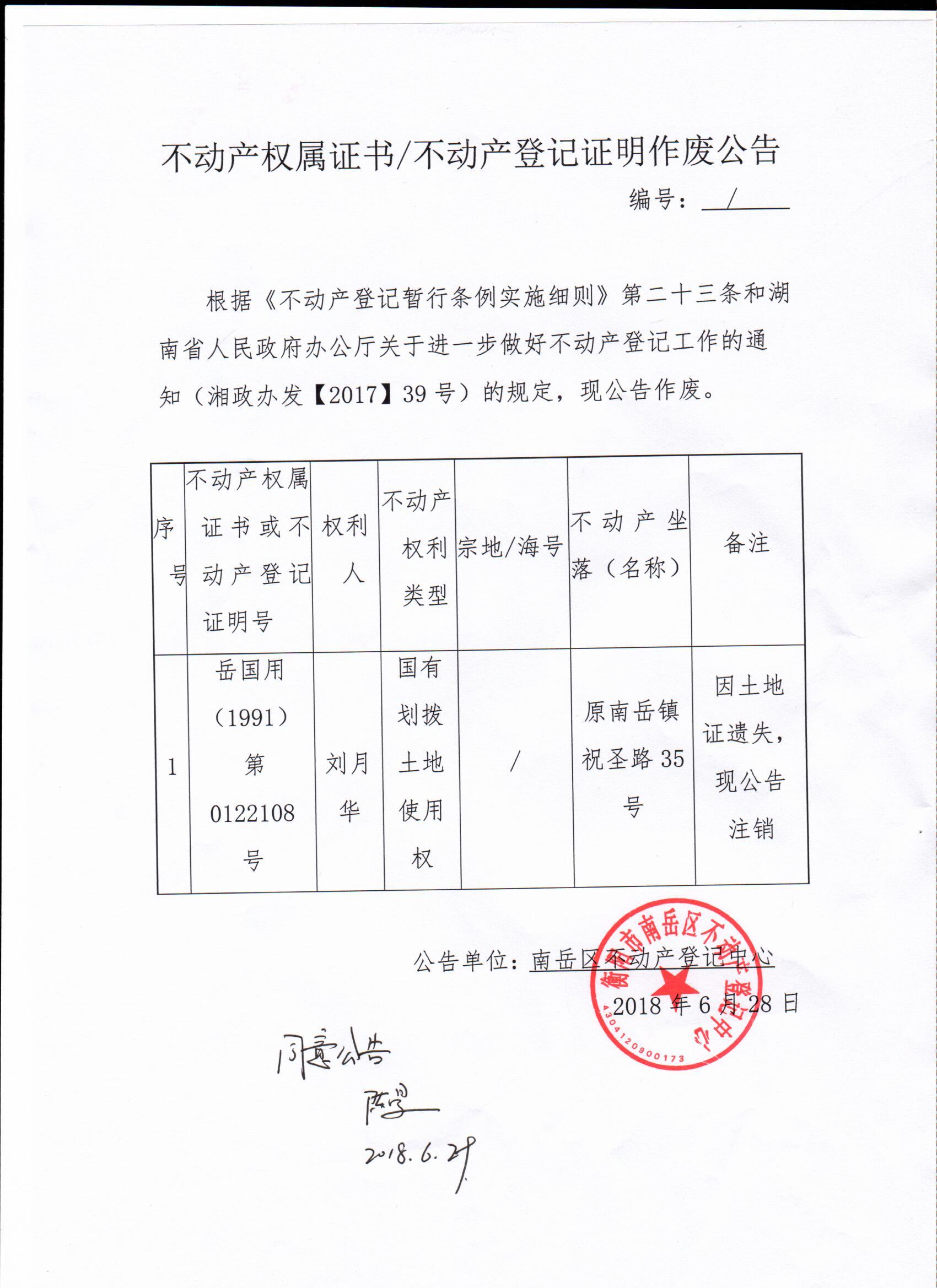 岳国用(1991)第0122108号不动产权属证书/不动产登记证明作废公告