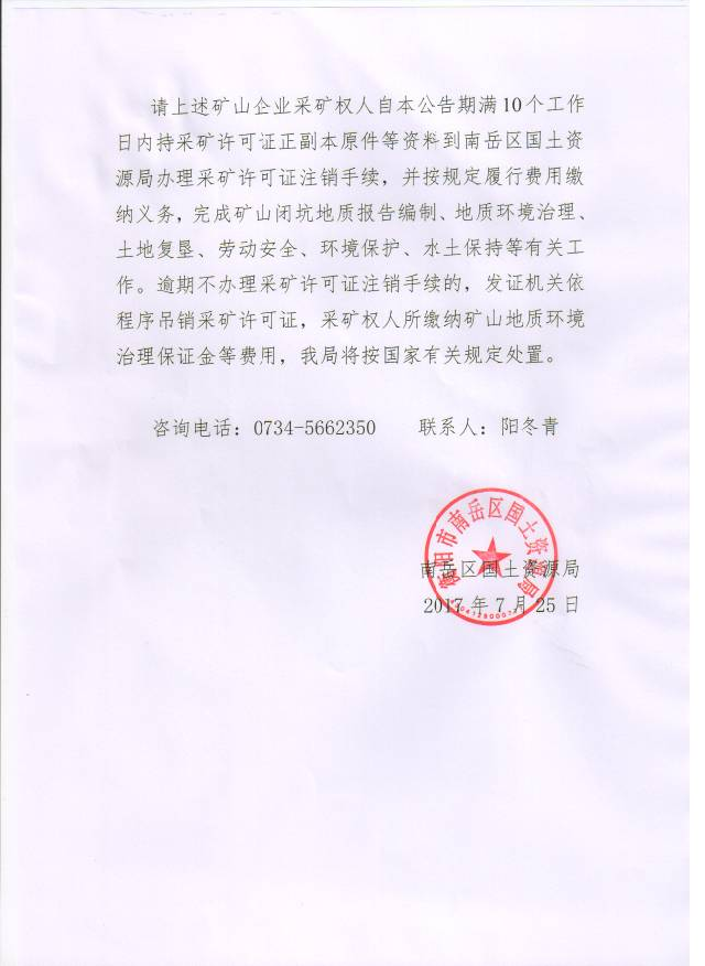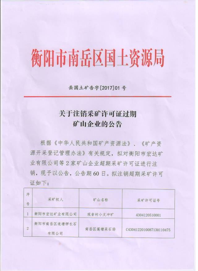 衡阳市南岳区国土资源局关于注销采矿许可证过期矿山企业的公告