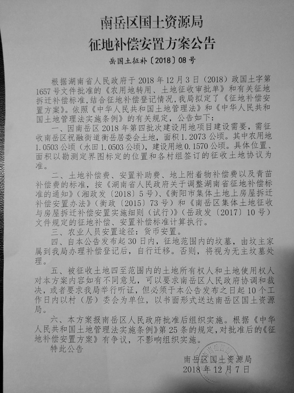 南岳区国土资源局征地补偿安置方案公告(岳国土征补【2018】08号)