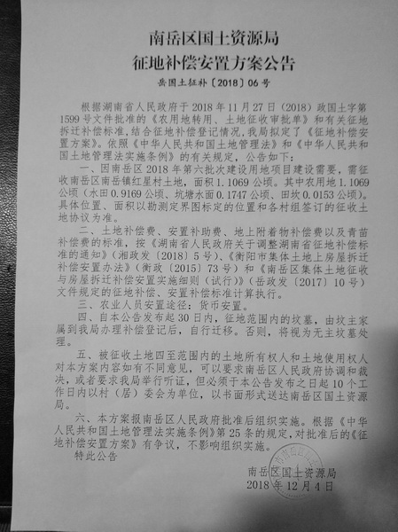 南岳区国土资源局征地补偿安置方案公告(岳国土征补【2018】06号)