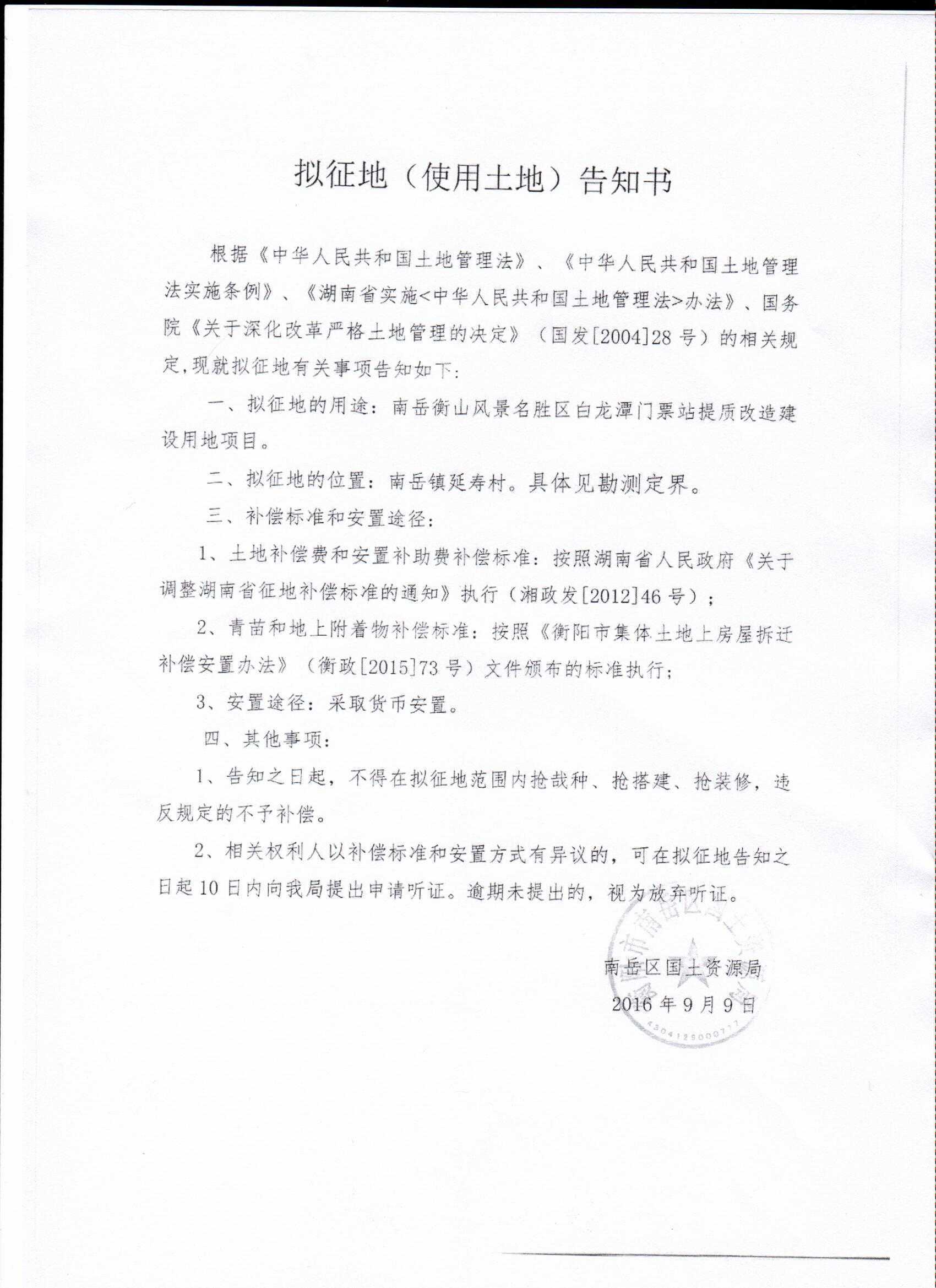 南岳区风景名胜区白龙潭门票站提质改造建设用地项目拟征地告知书