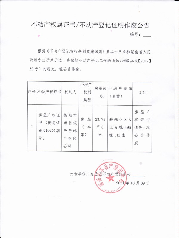 不动产权属证书/不动产登记证明作废公告(振华房地产)