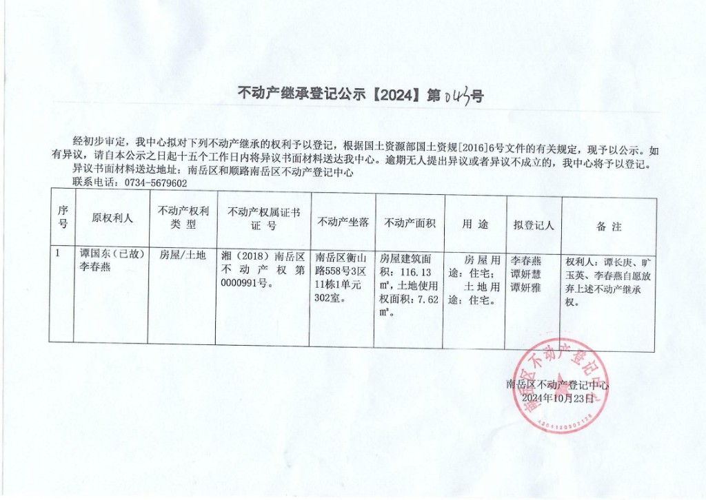 不动产继承登记公示【2024】第043号 李春燕、谭妍慧、谭妍雅