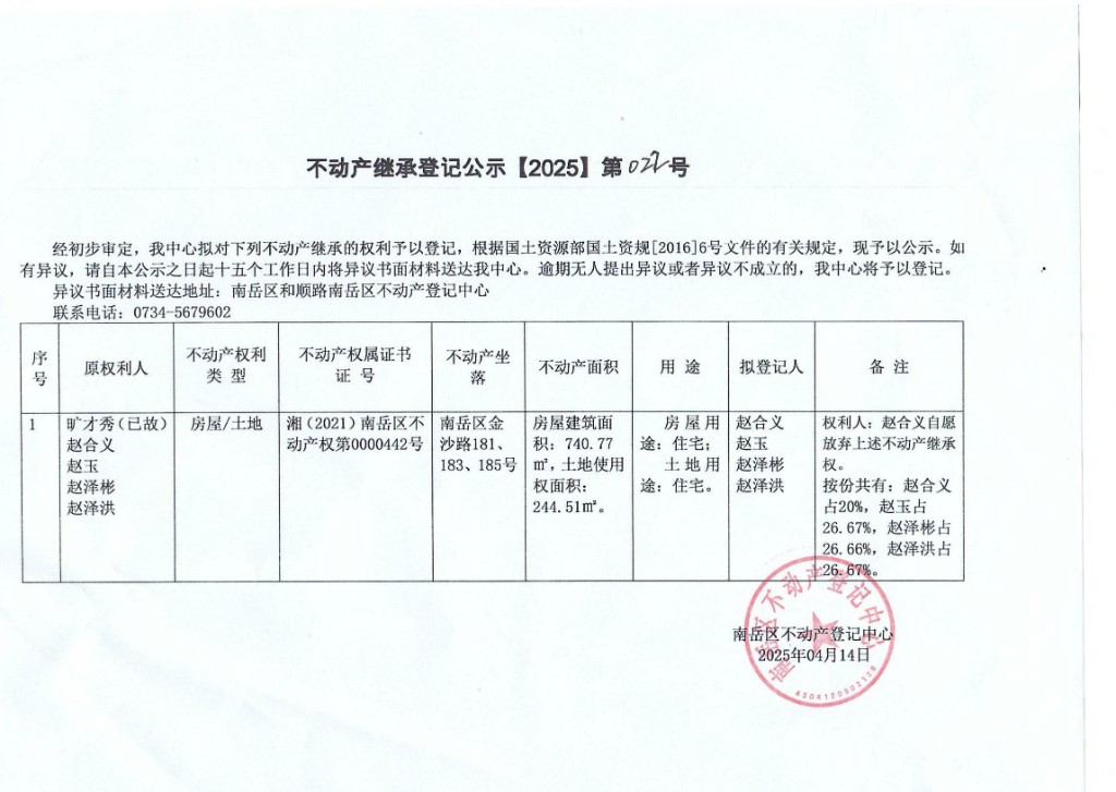 不动产继承登记公示【2025】第022号 赵合义、赵玉、赵泽彬、赵泽洪