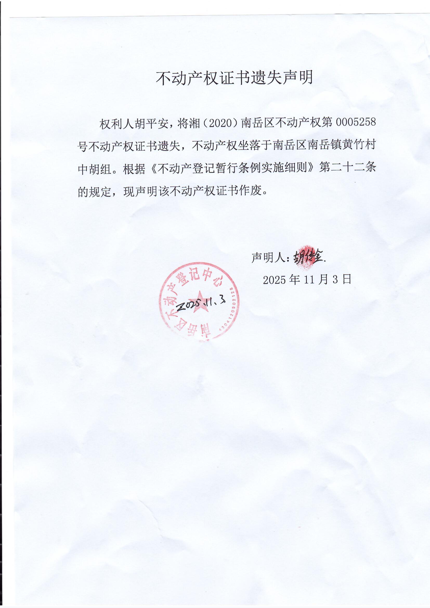 不动产权证书遗失声明(胡平安)