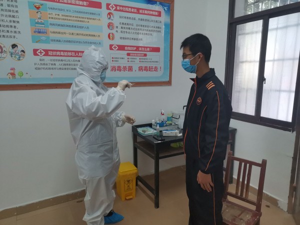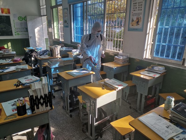 待疾控部门和医护人员将学生接走后,保健教师脱离防护服、消毒后离开隔离室。聂副校长组织消毒人员对隔离室进行消毒。