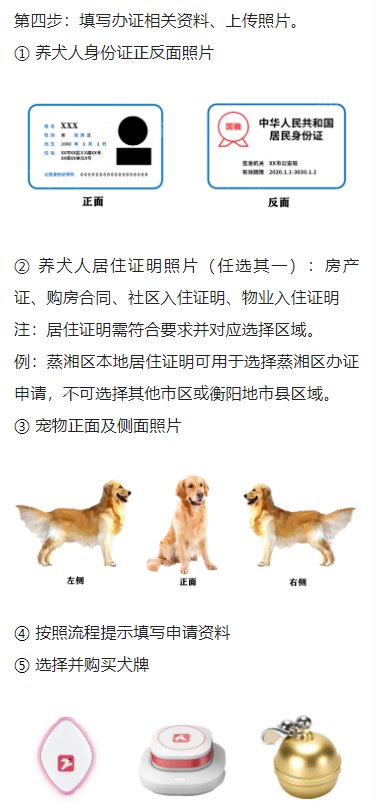 1、养犬人身份证(身份证,须年满18周岁本地居民);2、养犬人居住证明(房产证、居住证、租房合同、购房合同、社区证明,任选其一即可);3、到免疫点办理电子免疫证(可以在68宠物APP上选择就近的宠物医院接种疫苗办理免疫证,目前南岳暂无合适的宠物医院);4、犬只的品种、年龄、主要体貌特征和站立、两侧全身的彩色照片(无需纸质的照片)。