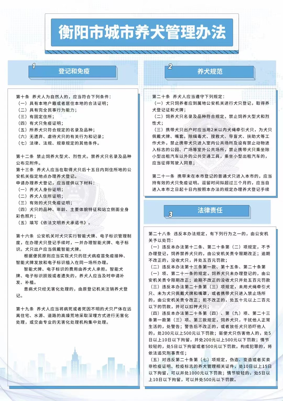 《衡阳市城市管理养犬办法》已于2021年6月25日正式施行,请广大居民朋友们根据养犬办法规范养犬。犬主可根据衡阳市犬证办理流程图准备相关资料进行网上犬证申办。