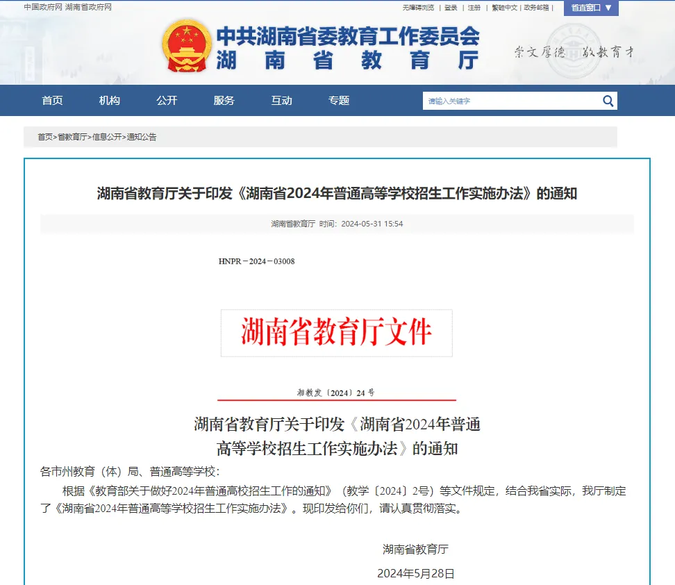 近日湖南省教育厅发布《湖南省2024年普通高等学校招生工作实施办法》