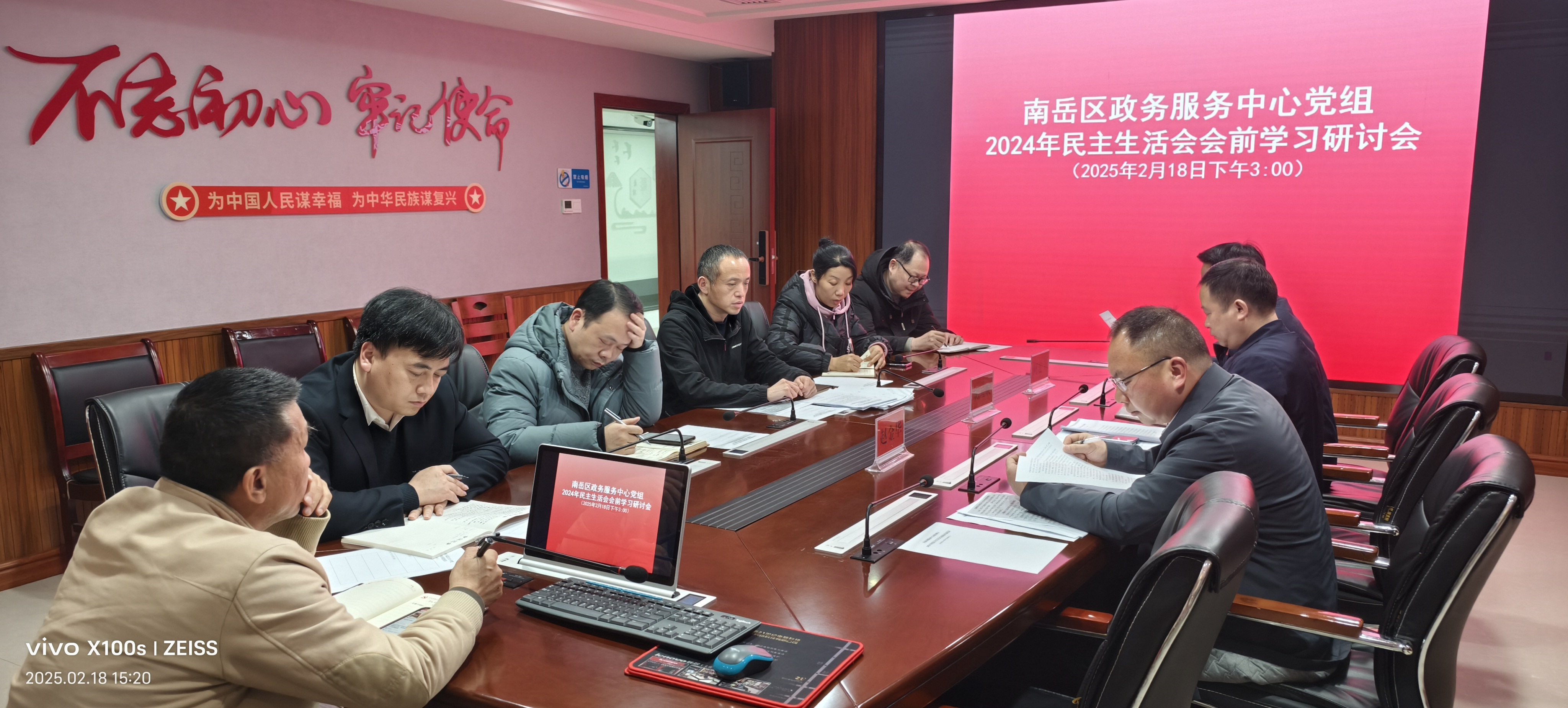 2月18日下午,南岳区政务服务中心召开党组理论学习中心组(扩大)会议,专题开展2024年度民主生活会会前集中学习研讨。区政务服务中心党组书记、主任胡国顺主持会议,党组成员、股室负责人和全体党员干部参加会议。