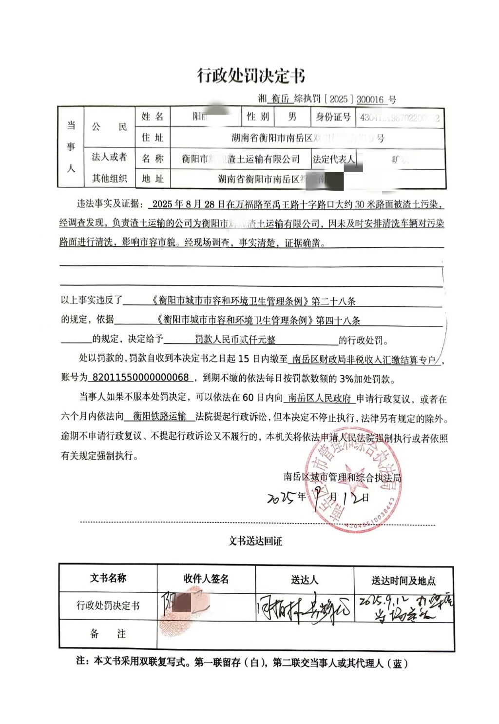 依据《衡阳市城市市容和环境卫生管理条例》第四十八条的规定,城市管理和综合执法局对该公司车辆在渣土运输过程中造成的遗撒遗漏造成路面污染的行为,作出罚款2000元的行政处罚。当事公司对处罚决定无异议,并在期限内缴纳罚款,该案办结。