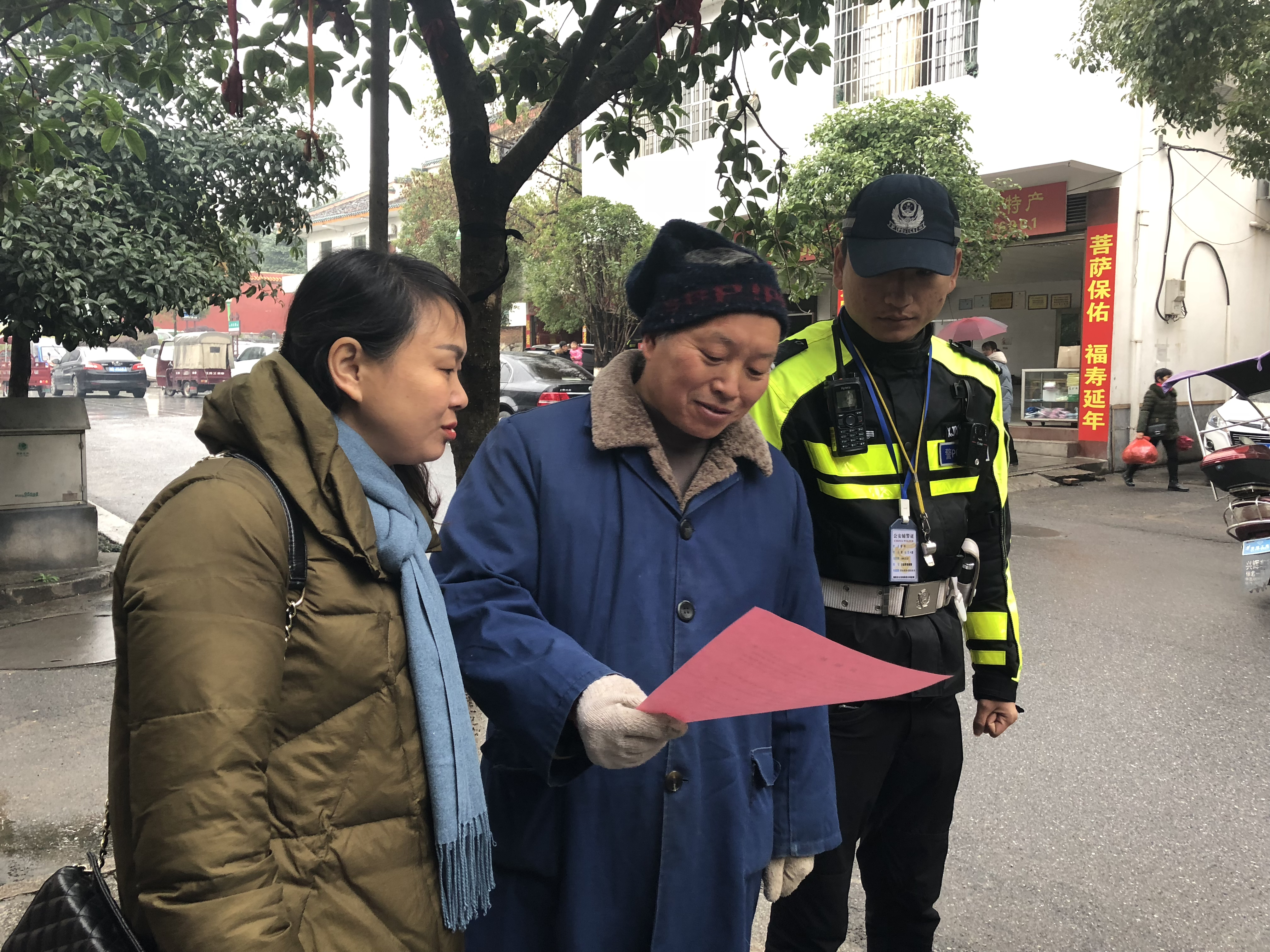 (图为祝融街道综治办文秋兰主任与交警同志向居民发放、解说告知书)