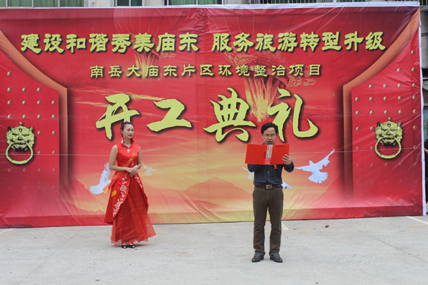 开工仪式上,项目牵头责任单位祝融街道办事处主任曹文球介绍了庙东片区项目基本情况、南岳区人民政府副区长提名人选、祝融街道办事处书记徐红松代表庙东项目指挥部指挥长蒋炳炎书记做了表态发言、湖南百汇置业有限公司作为项目建设方做表态发言。区人大常委会主任彭旺元宣布项目开工。
