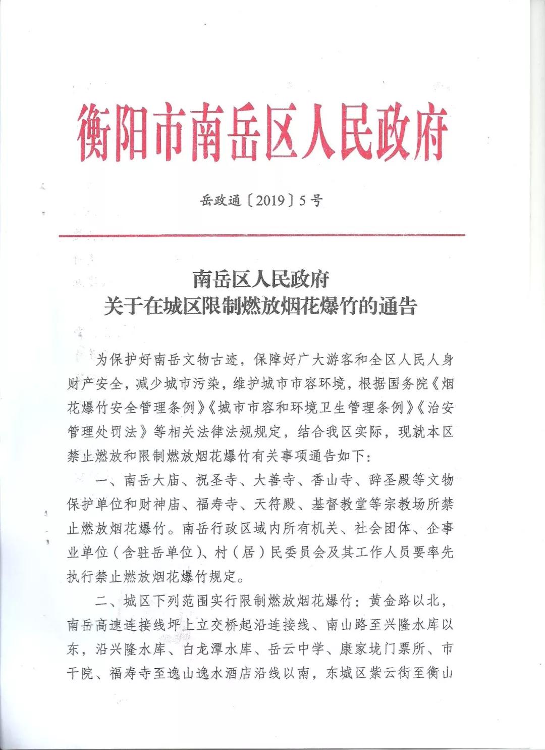 3、南岳文化古迹众多,森林密度高,城区人口相对密集,高空烟花等的燃放极易引起火灾和伤人事故,直接危害人民群众的生命财产安全。