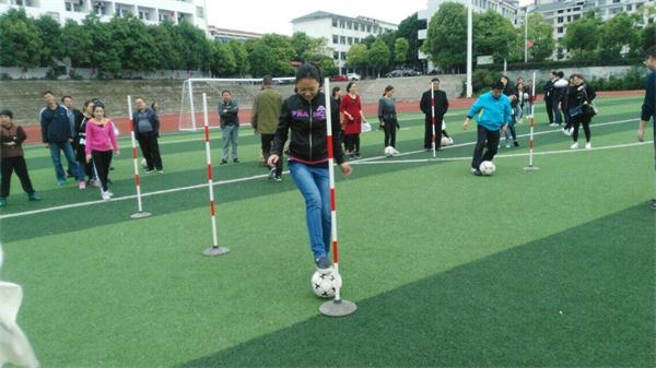 全校80余名教职工分年级参加了趣味活动。3支代表队依次登场,先是足球定点射门比赛。参赛队员各显神通,弯腰、瞄准、定点、起脚、射门,球进了!观众群中顿时爆发出阵阵喝彩声;没能射中的则在一旁为之惋惜。接下来同时进行运球(足球)绕杆接力比赛,参赛队员专心踢球,全神贯注,不断地调整脚下的步伐,以防止球撞到杆或是太过偏离。有的老师从容地带球前进,虽然速度慢了些,但在稳中前进,有的老师则偶尔一激动踢得过快,绕过了两三个杆,还得手忙脚乱地踢回来继续前进……旁边的啦啦队大声提醒,加油助威,笑声、欢呼声、呐喊声在美丽的校园里回响。