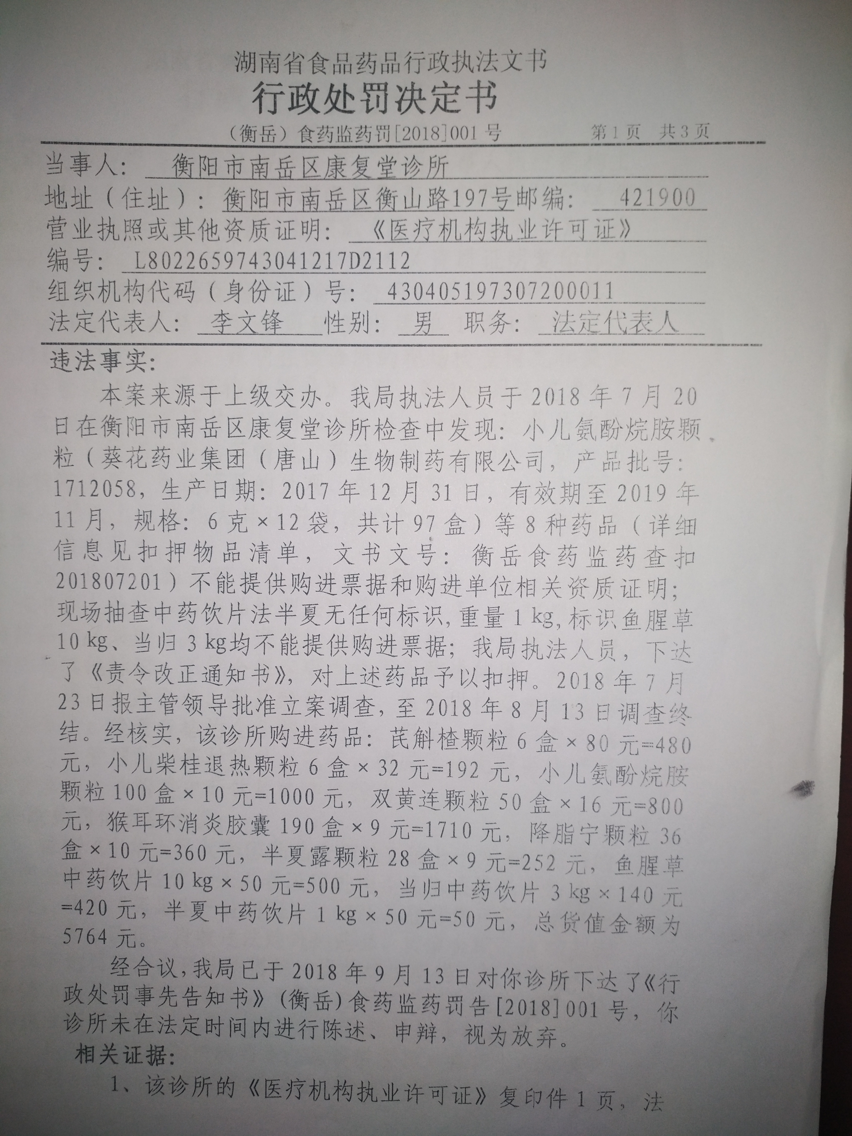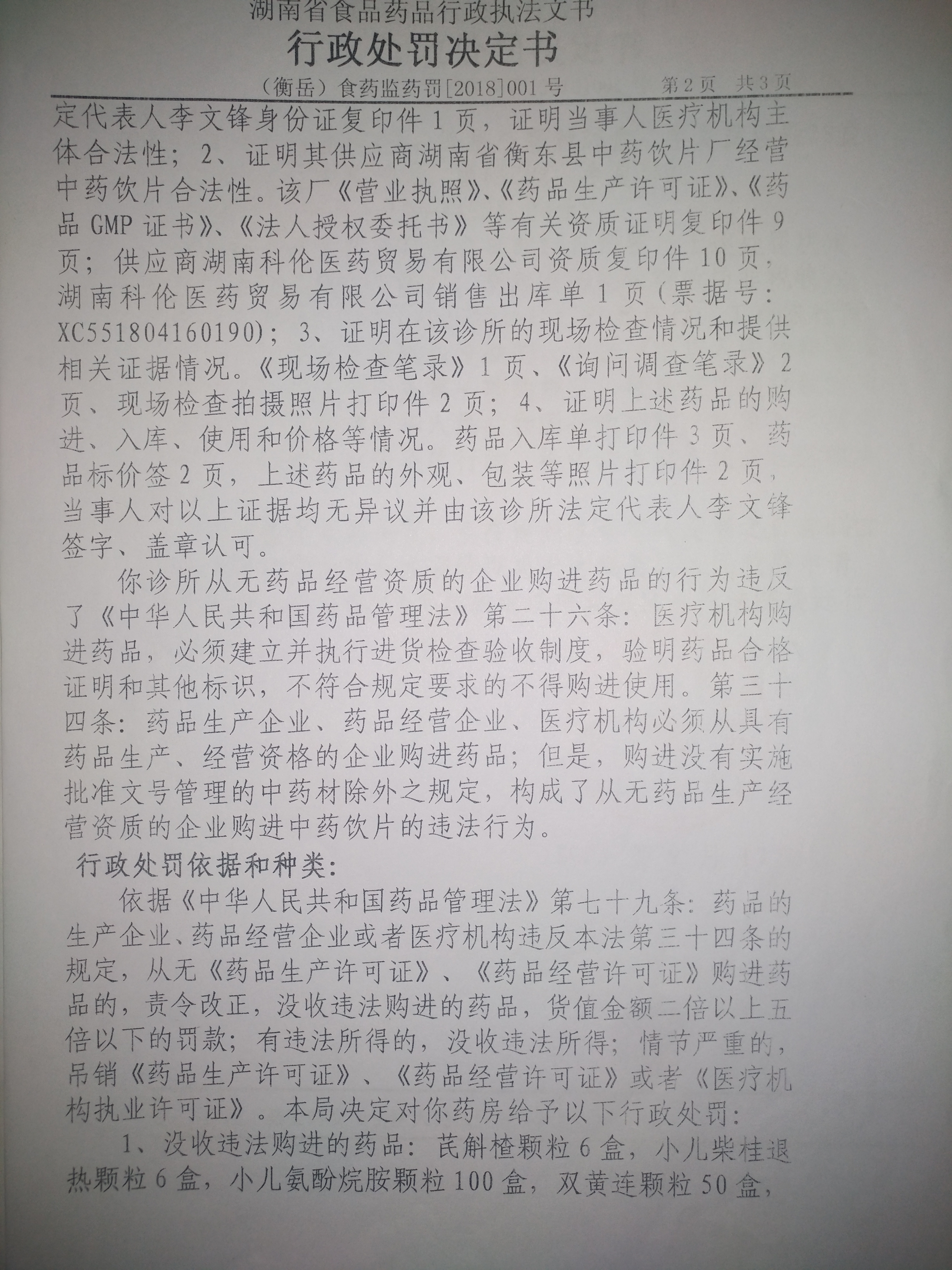衡阳市南岳区康复堂诊所涉嫌从无药品生产经营资质的企业购进药品案