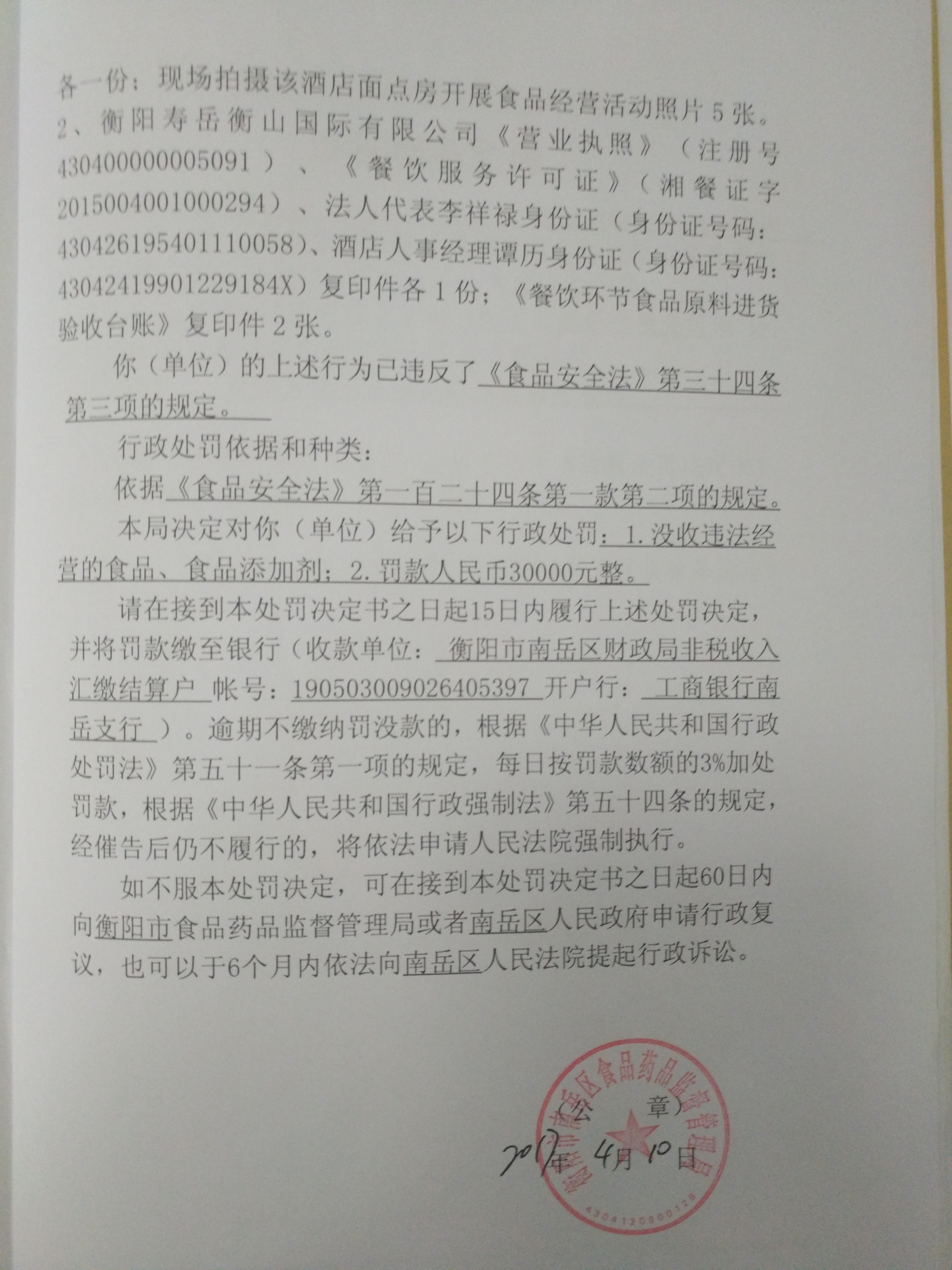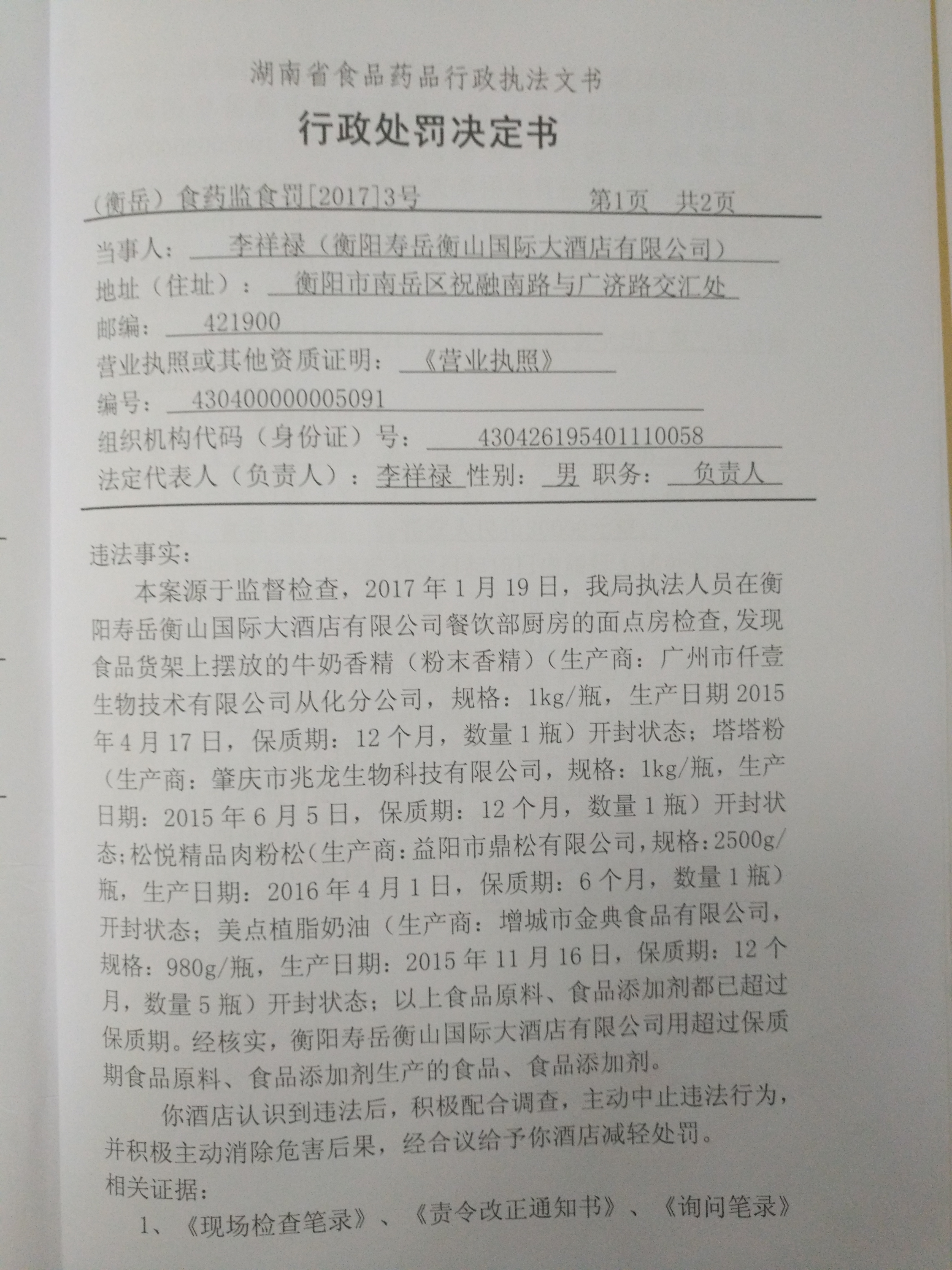 关于衡阳寿岳衡山国际大酒店有限公司用超过保质期的食品原料、食品添加剂生产食品、食品添加剂案的公示