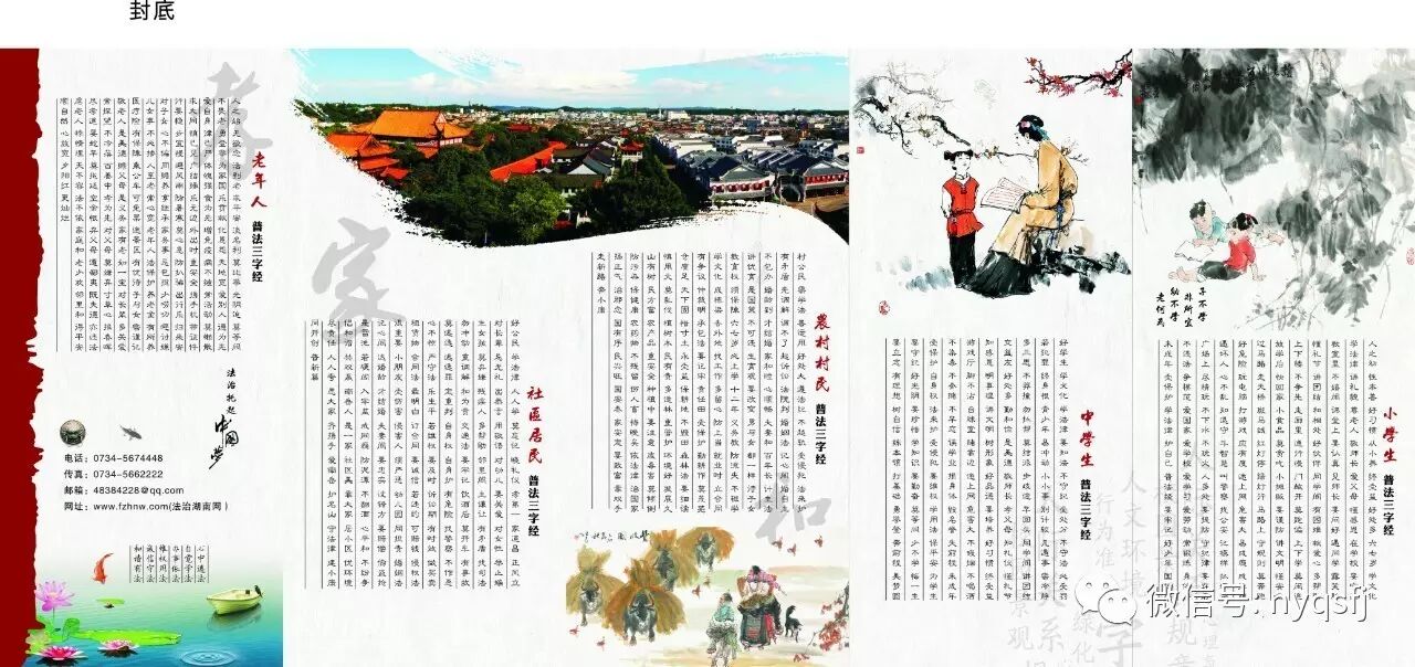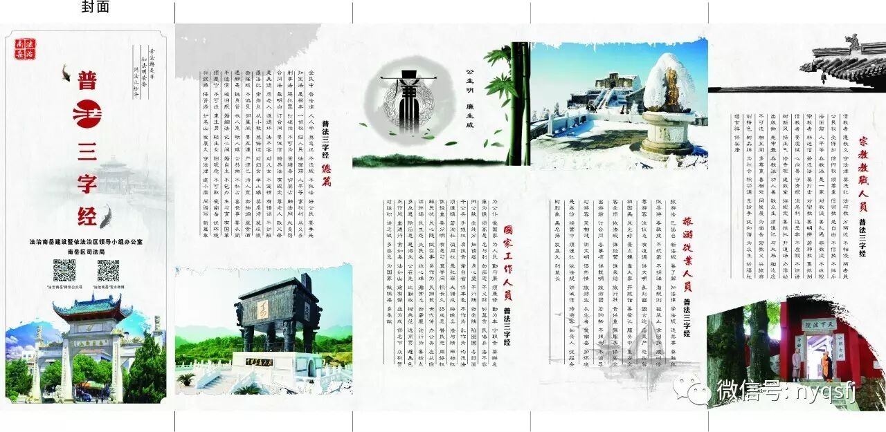 我区法治办、司法局认真贯彻落实党的十八届四中、六中全会精神,抢抓全面推进依法治国,司法体制改革全面铺开的历史机遇,努力推行法治文化建设,在总结中求创新,在创新中求突破,将传统文化中的“三字经”与现代法制教育相结合,历时半年之久,按不同领域、不同行业、不同群体的特点,编撰了独具匠心的普法“三字经”,内容涉及党政领导干部、老年人、中学生、小学生、旅游从业人员、农村农民、社区居民、宗教教职人员等八类对象,共2600多字,篇幅不长,但形式新颖,主题鲜明,语言精练、朗朗上口。截止目前,共发放普法“三字经”6万余份,普法对象单篇5万余份,深入村组社区、机关学校、旅游企业、寺庙宫观免费宣讲近100场次,系列宣讲活动被法制日报、湖南日报、衡阳日报、红网、法治湖南网等多家新闻媒体广为报道,深受社会各界好评。2015年3月,司法部领导来岳调研,对普法“三字经”给予了充分肯定,拟在全国宣传推广。2016年12月普法“三字经”被湖南省司法厅确定为第二批“省级法治文化示范项目”。