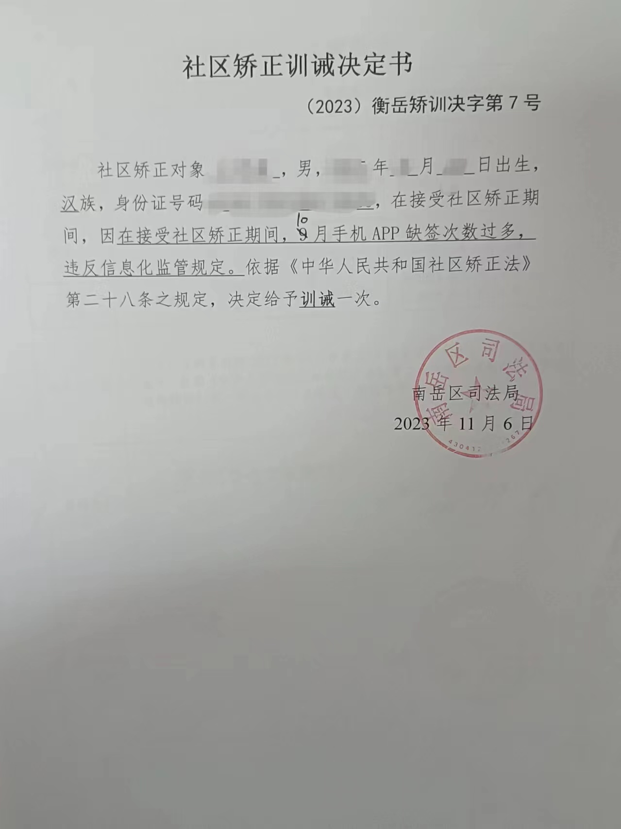 2023年社区矫正训诫决定书第7号