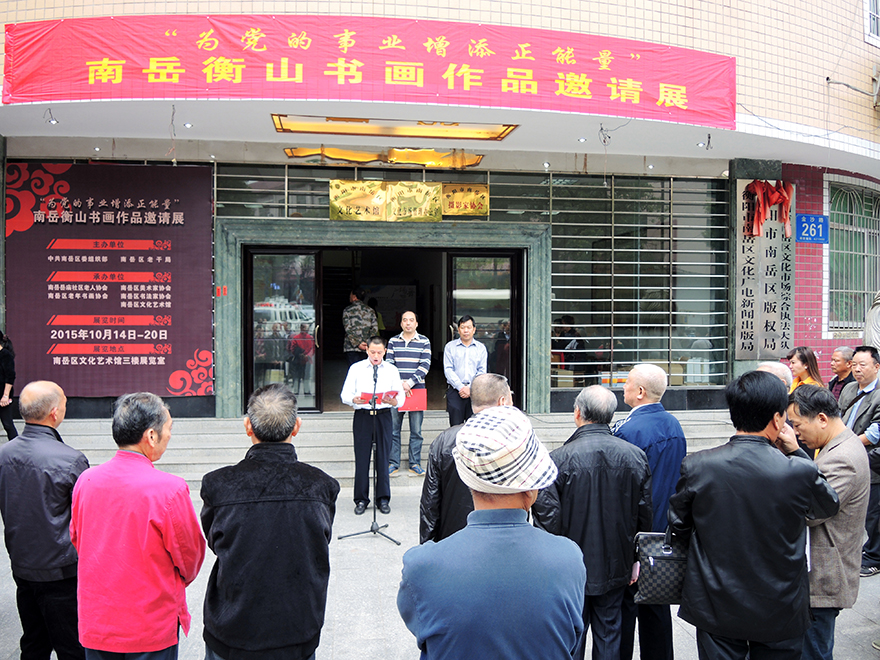 开展仪式由区委常委、组织部长、统战部长胡书伟主持。区委副书记、政法委书记蒋炳炎致辞,希望全区的老干部、老同志主动发挥自己的优势,更加自觉的为党和政府分担团结群众、凝聚人心的重任,积极传播健康向上的正能量,使老年生活更加丰富多彩,使南岳的社会环境更加和谐美好。这次书画展共有南岳、衡山、衡东三地150幅作品参展。参展作品形式多样,立意新颖,主题突出,特色鲜明,抒发了对名山壮丽山河的赞美,对幸福生活的美好祝愿。特别是退休老领导的参展作品,体现了他们心存中国梦,胸怀寿岳情,积极参与社会事业、发挥光和热的良好精神风貌。市文联主席林乐伦、副区长黄顺发观看了展览。