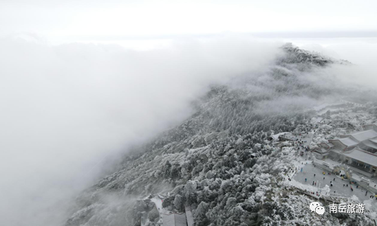 寒冷的冰霜将道路扑了个满怀;洁白的雪花安详地躺在树枝;早间的雾气把山间围得水泄不通;来往观赏祈福的人群熙熙攘攘;登上山顶的观景台,向远方眺望,衡山万里,在冰与雪的交织下,交相辉映,格外壮观。