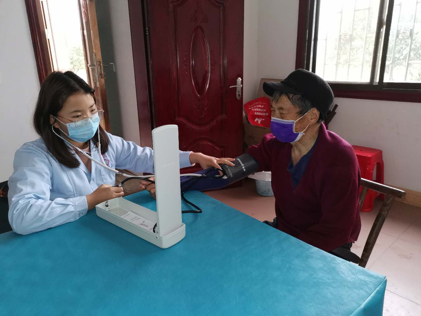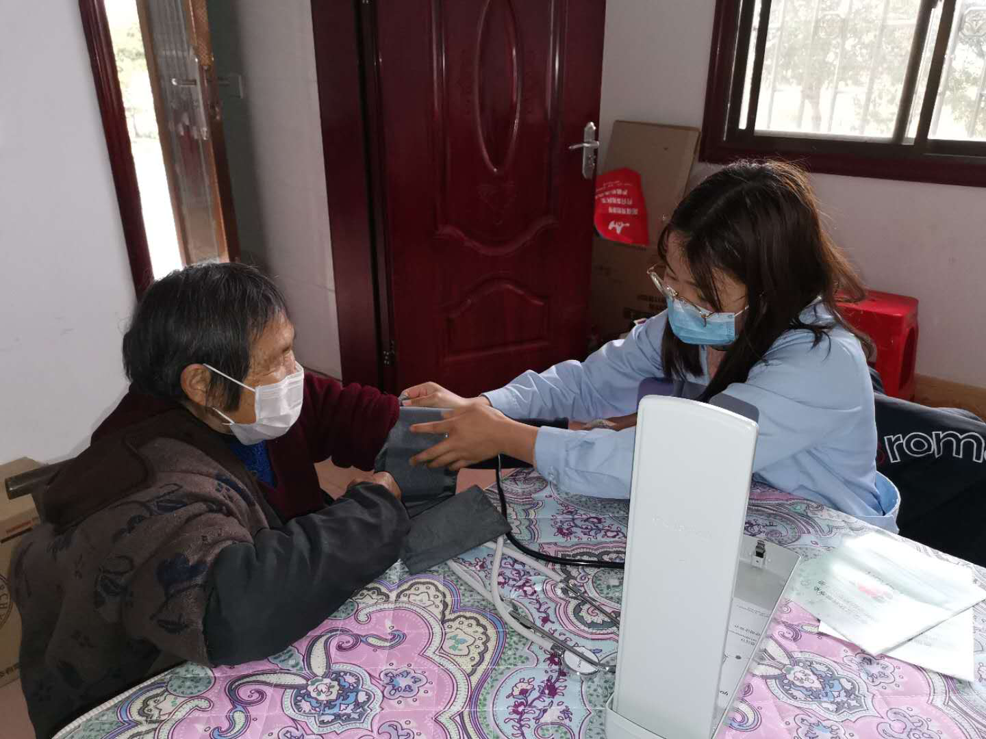 “奶奶,您今天的血压还是有点高啊,一定要记得按时服药,目前疫情防控还是不能松懈,每天继续戴口罩、少出门、勤洗手、多通风。”3月2日清早,村卫生室谭医生就来到建档立卡贫困户家里,为她测量血压、血糖,并带来了降压降糖药、口罩和消毒用品。测好血压的刘奶奶整好衣袖激动地说:“真是太感谢你们了!疫情防控这么忙,还大老远挂念着给我检查、送药送物资,真是辛苦你们了。”