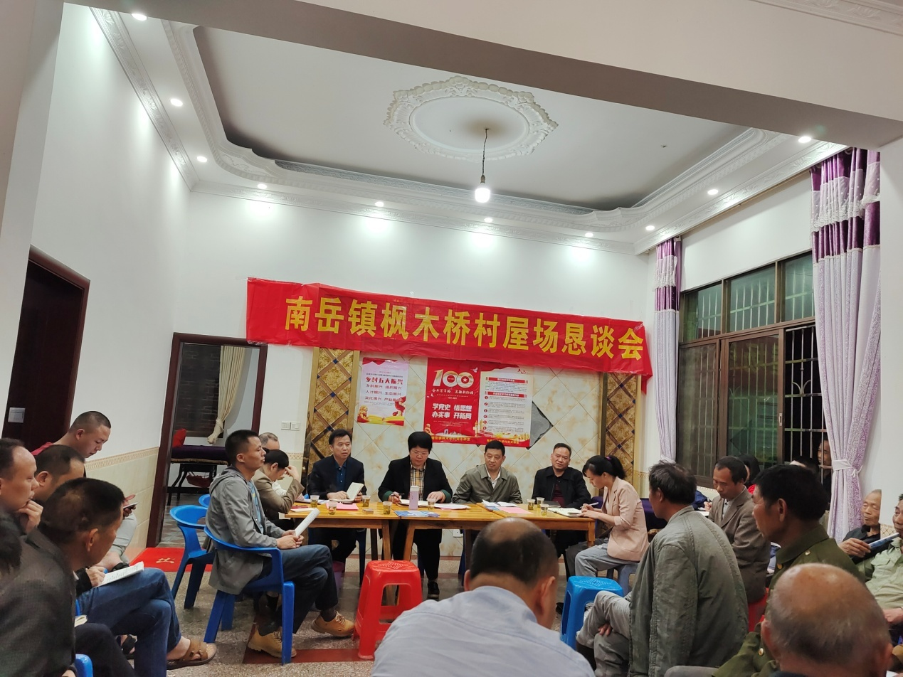 5月27日晚上,细雨微凉,在枫木桥村新乔组的一户村民家里,区人大副主任旷文峰、区人大环资委主任旷文明、区卫生健康局局长旷国华、区国有林场场长张安星、南岳镇联点领导、驻村工作队、村支两委召开“党史教育+屋场恳谈”会,宣传相关政策,聆听群众声音,共商乡村振兴发展。此次屋场恳谈会参与群众50余人。