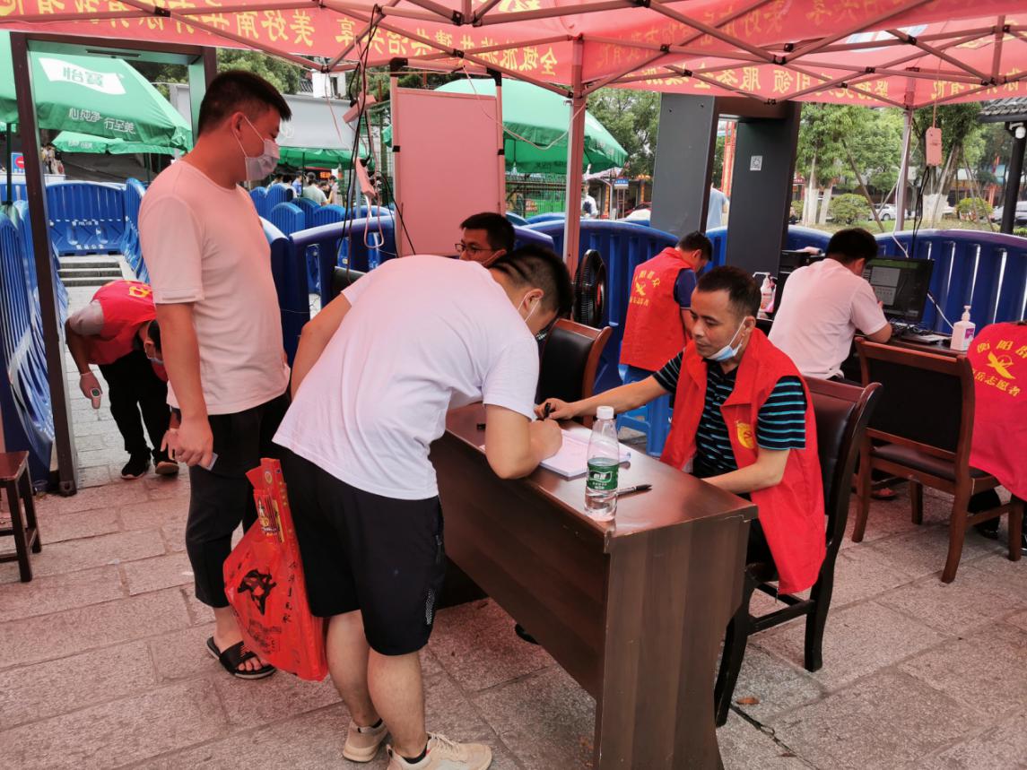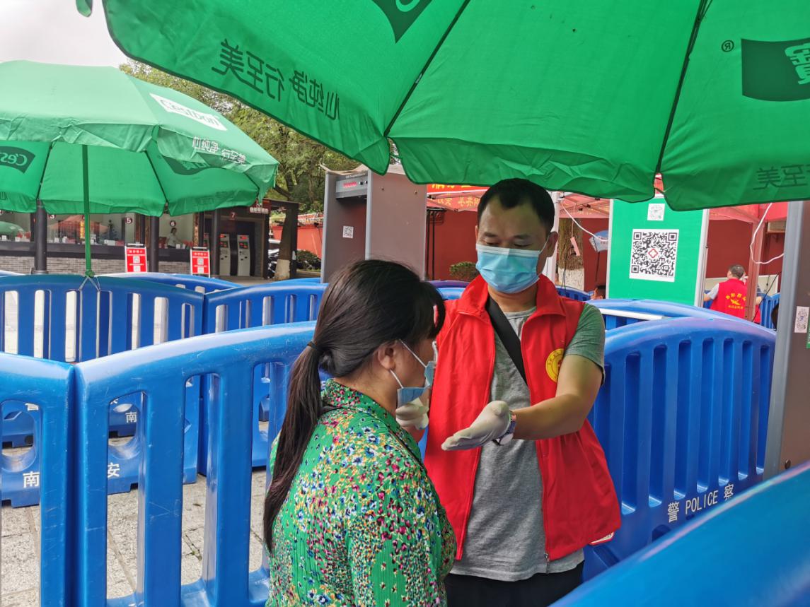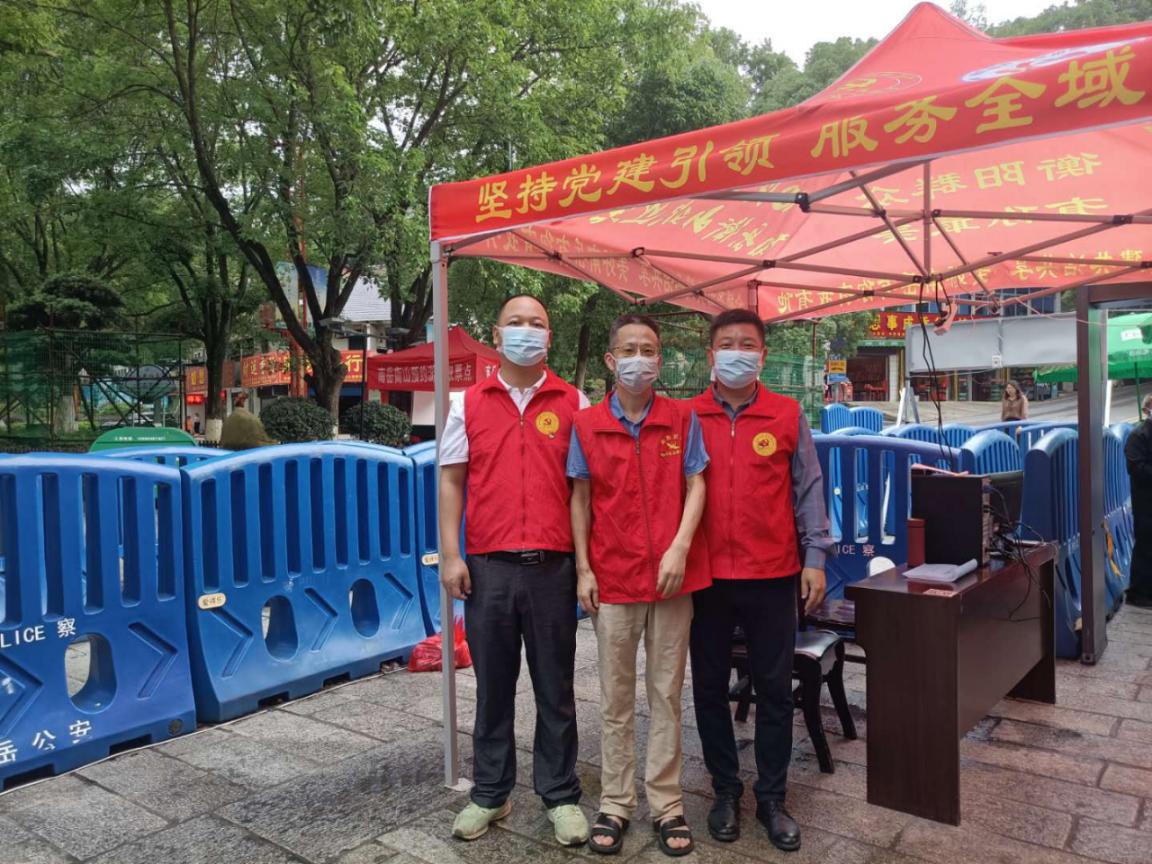 自5月30日南岳大庙恢复开放以来,按照区委部署,区直机关各单位党组织的党员志愿者们穿着红马甲,在南岳大庙前后门分别设置服务点,负责给游客检测体温、查看健康码及登记身份证信息等工作。图为南岳区自然资源局党员志愿者。