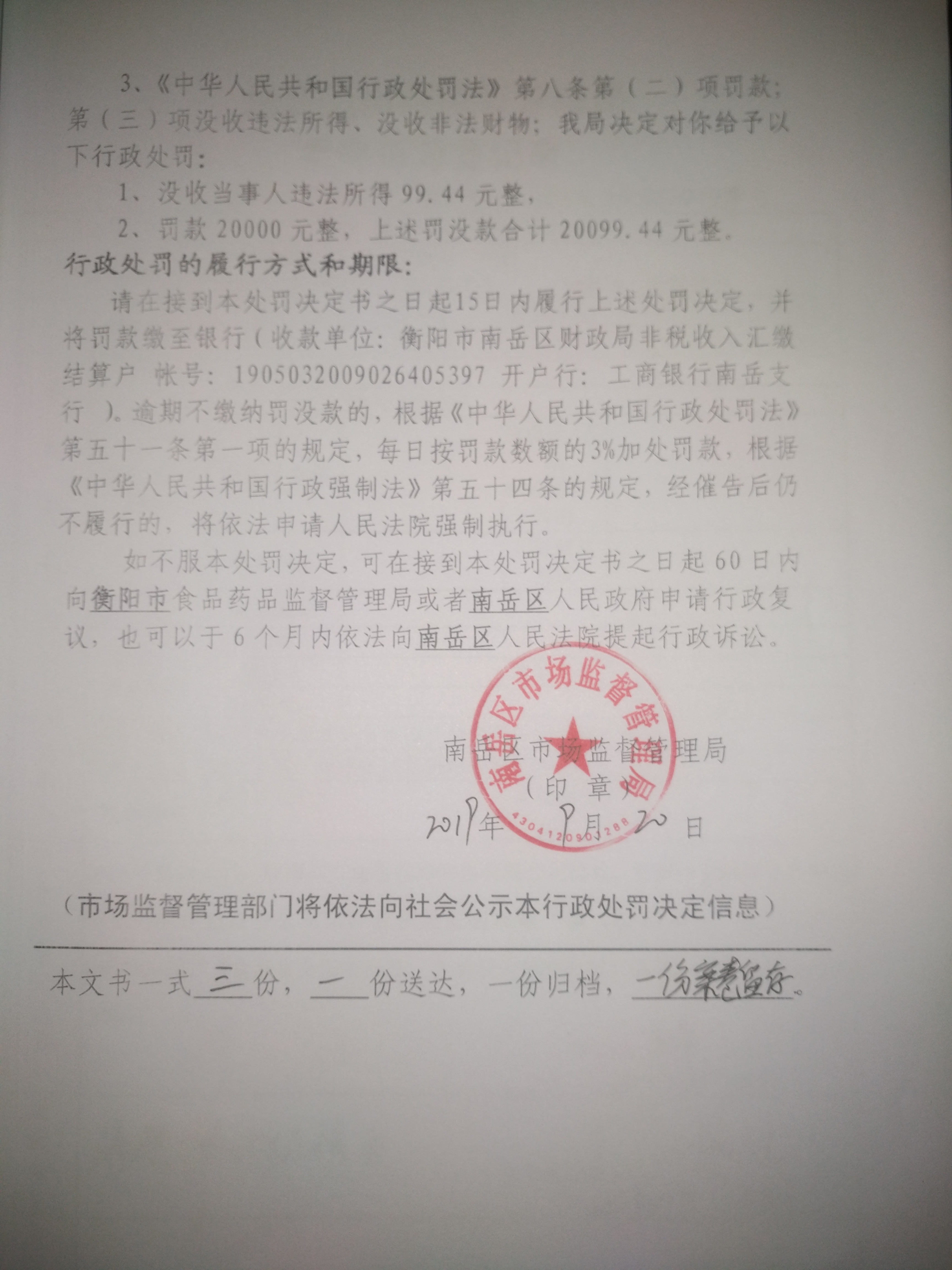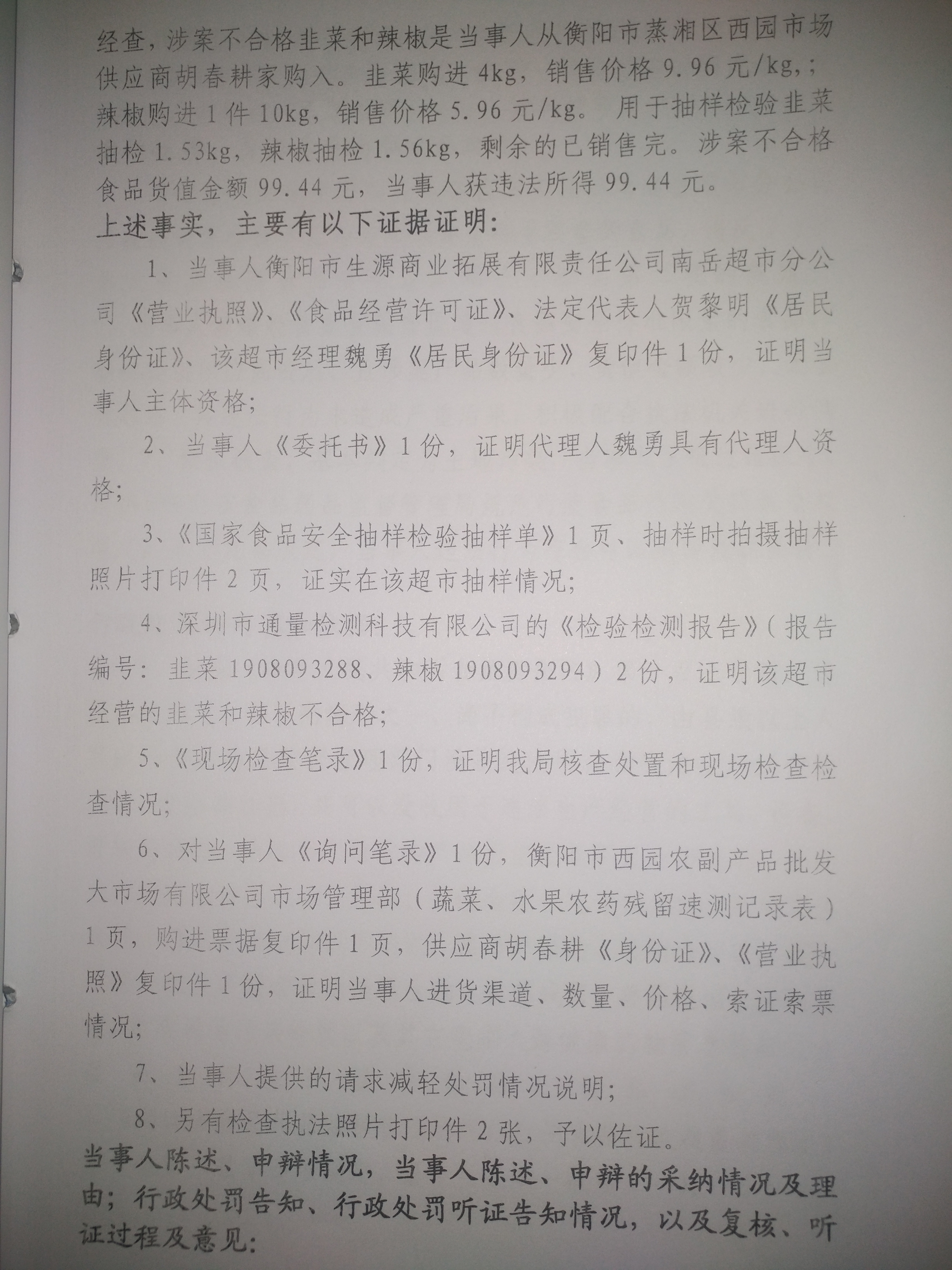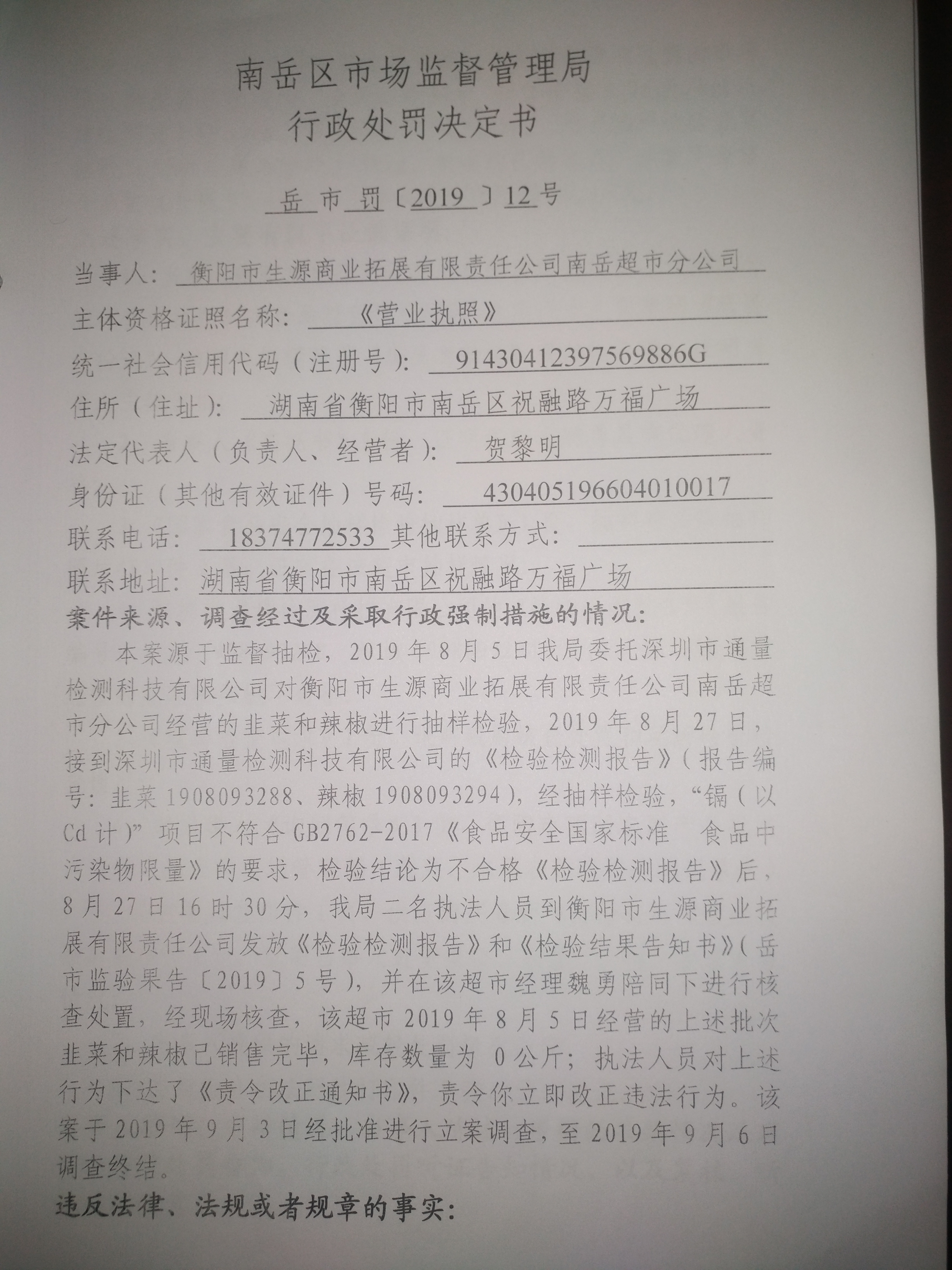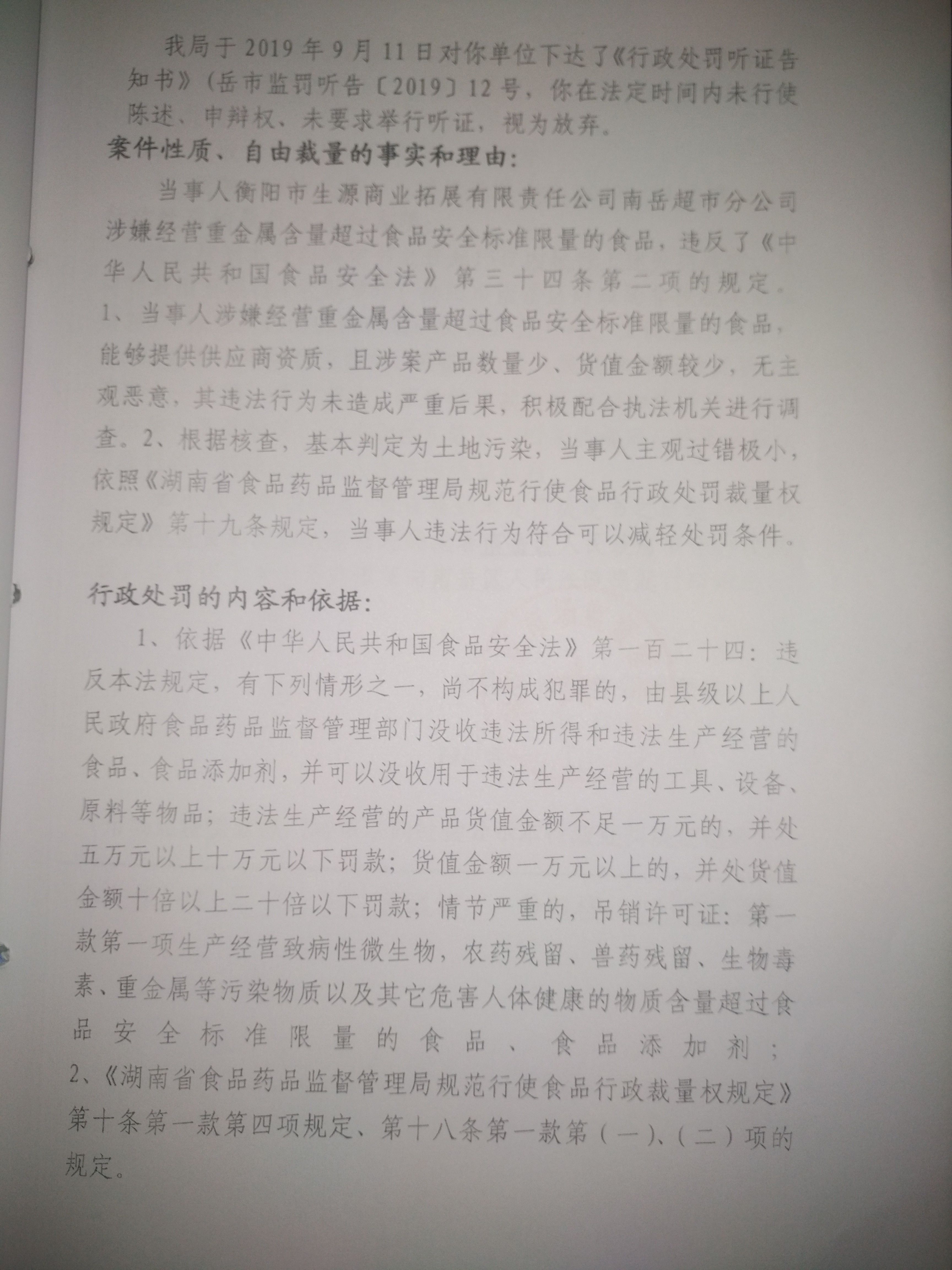 关于衡阳市生源商业拓展有限责任公司南岳超市分公司经营重金属含量超过食品安全标准限量的食品案的公示