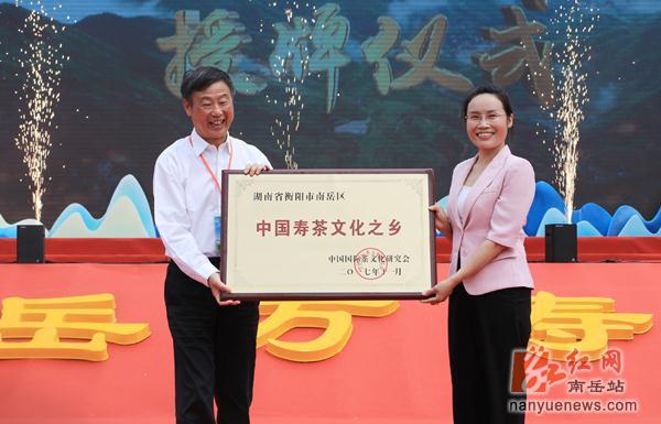 中国国际茶文化研究会副秘书长兼发展与促进部部长陈叙达先生为南岳区授“中国寿茶文化之乡”荣誉牌匾,以表彰南岳的茶寿文化源远流长。衡阳市茶叶协会常务理事会成员宣读衡茶复兴南岳宣言,以表达共同打造南岳一杯好茶的决心。现场评出全市“八百里南岳(衡山)十佳美丽茶园”,以茶兴旅、以旅促茶、以文传茶,推动茶区变景区、茶园变公园。现场还有五家优秀茶企响应政府号召,率先与贫困村签订“茶叶扶贫·一叶致富”的协议。