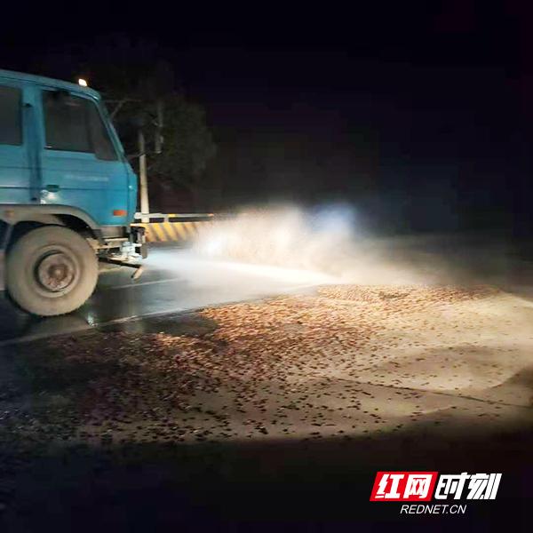 当晚,一辆货车的货物洒落在107国道1846公里处道路中间,执法队员在检查现场后发现,洒落的货物如不立即清除将导致路过车辆打滑或刹车失灵,存在很大的安全隐患,将严重威胁过往车辆的通行安全。于是,执法队员立即现场布控,一边疏导车辆通行,一边调度洒水车、装载机等救援车辆来清除路面障碍物,仅用40分钟便恢复了路面畅通,确保了通行安全。