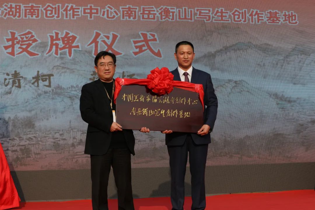 湖南省美协副主席、秘书长石纲宣读中国美协致双年展贺信,湖南省文联党组成员、副主席、秘书长邓清柯为“中国美术家协会湖南创作中心南岳衡山写生创作基地”授牌。