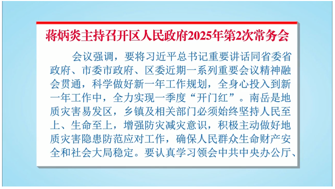 会议强调,要将习近平总书记重要讲话同省委省政府、市委市政府、区委近期一系列重要会议精神融会贯通,科学做好新一年工作规划,全身心投入到新一年工作中,全力实现一季度“开门红”。南岳是地质灾害易发区,乡镇及相关部门必须始终坚持人民至上、生命至上,增强防灾减灾意识,积极主动做好地质灾害隐患防范应对工作,确保人民群众生命财产安全和社会大局稳定。要认真学习领会中共中央办公厅、国务院办公厅关于节庆、展会、论坛活动的管理办法,严格落实习惯过紧日子要求,严格相关活动审批及备案程序,严守财经纪律,坚决杜绝违法违纪问题出现。