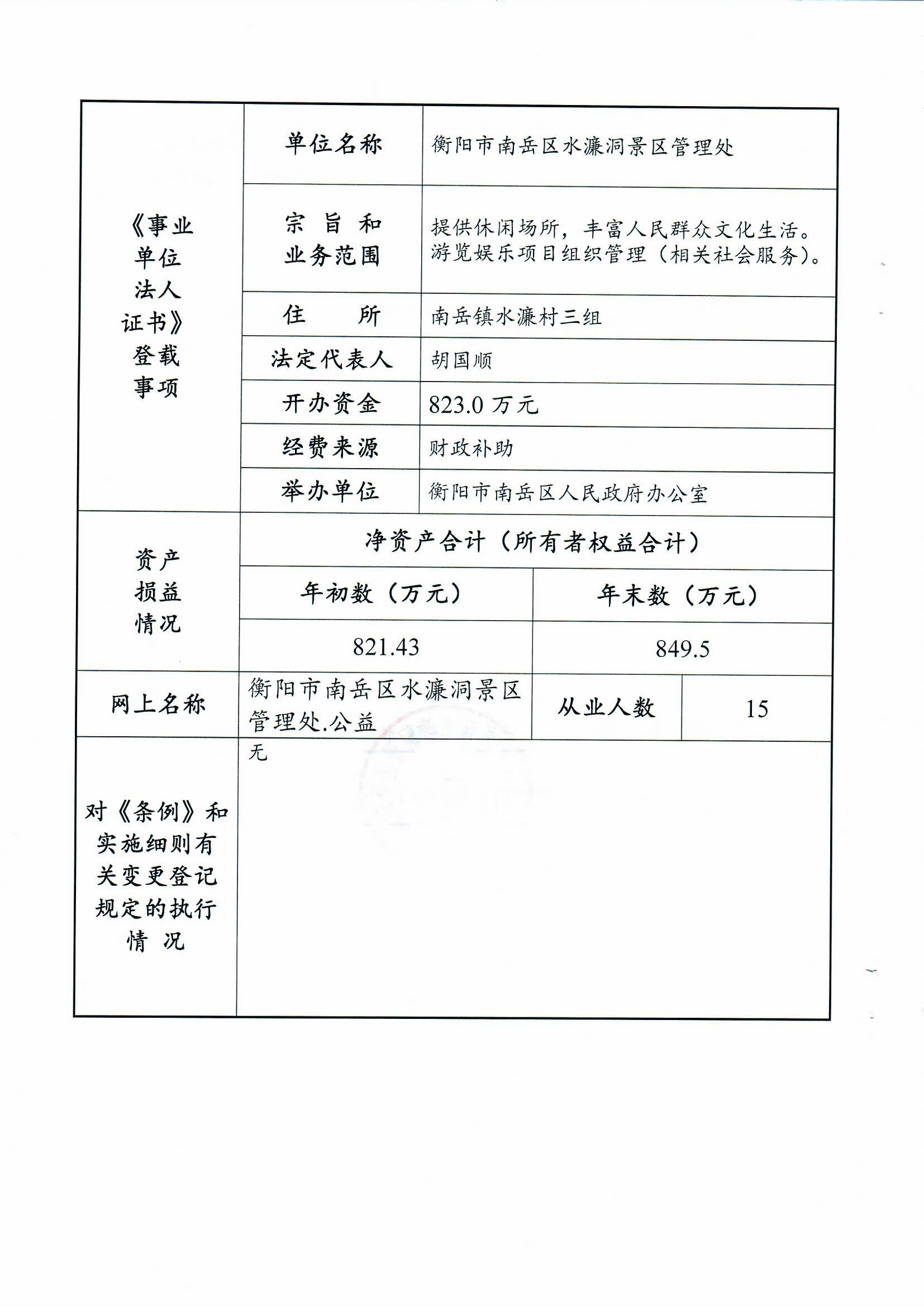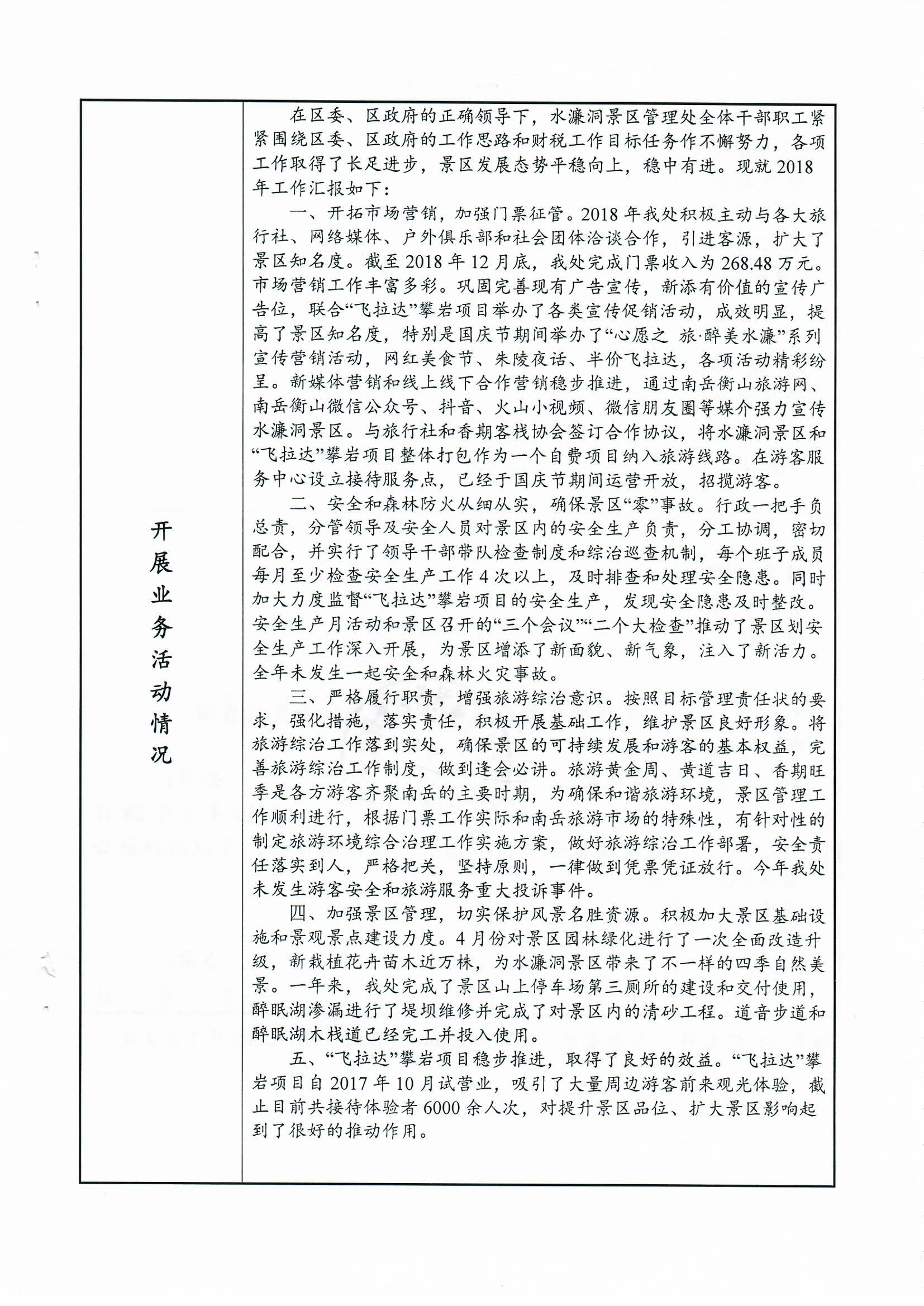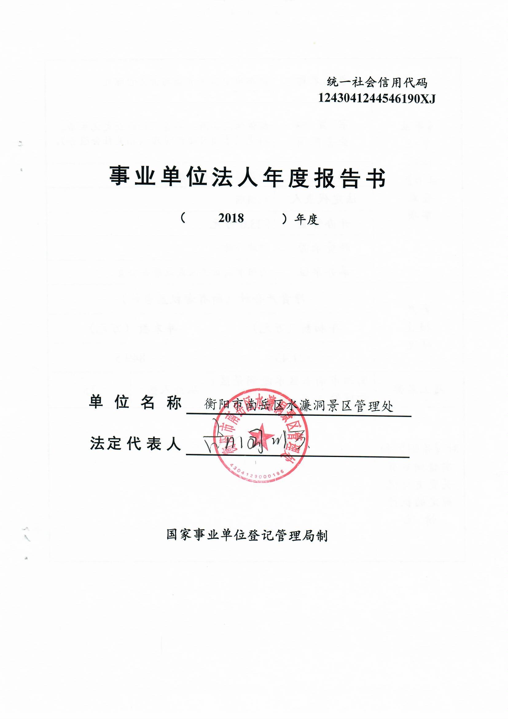 衡阳市南岳区水濂洞景区管理处2018年度事业单位法人年度报告书