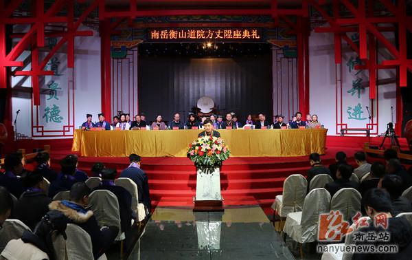 在“道化天下·德在人间”南岳衡山道院方丈升座典礼上,区委书记曾建华首先致欢迎辞,他说,南岳衡山是衡阳乃至湖南道文化的道脉所在。道教自东汉末年传入南岳,至今已有1700多年的历史。希望南岳道教以此次升座为契机,以党的十九大精神为指引,进一步传承全真道统,坚持正信正念,弘扬道教优秀文化,树立道教良好风范,为弘扬南岳特色宗教文化、推进宗教与旅游融合发展,把南岳建设成为国际精品旅游目的地作出新的更大贡献。