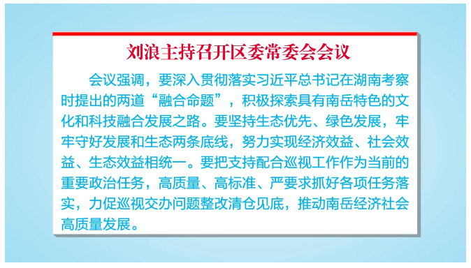 会议强调,要深入贯彻落实习近平总书记在湖南考察时提出的两道“融合命题”,积极探索具有南岳特色的文化和科技融合发展之路。要坚持生态优先、绿色发展,牢牢守好发展和生态两条底线,努力实现经济效益、社会效益、生态效益相统一。要把支持配合巡视工作作为当前的重要政治任务,高质量、高标准、严要求抓好各项任务落实,力促巡视交办问题整改清仓见底,推动南岳经济社会高质量发展。