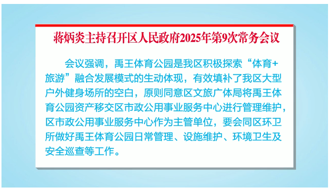会议强调,禹王体育公园是我区积极探索“体育+旅游”融合发展模式的生动体现,有效填补了我区大型户外健身场所的空白,原则同意区文旅广体局将禹王体育公园资产移交区市政公用事业服务中心进行管理维护,区市政公用事业服务中心作为主管单位,要会同区环卫所做好禹王体育公园日常管理、设施维护、环境卫生及安全巡查等工作。