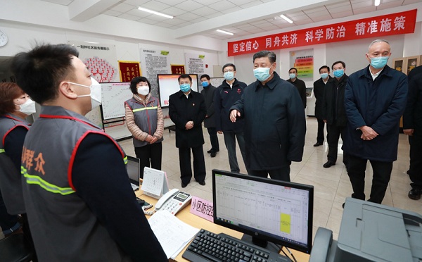 2月10日,中共中央总书记、国家主席、中央军委主席习近平在北京调研指导新冠肺炎疫情防控工作。这是习近平在朝阳区安贞街道安华里社区,了解基层一线疫情联防联控情况。新华社记者 庞兴雷 摄